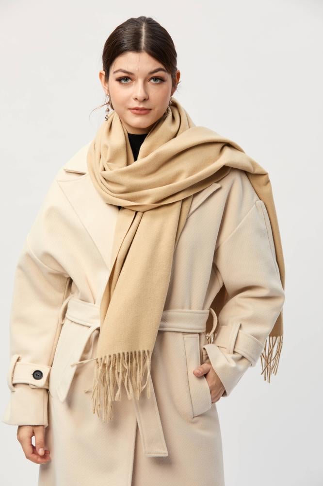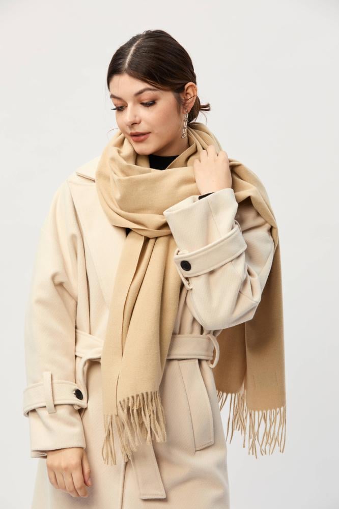 أضيفي لمسة متنوعة إلى إطلالتك في الأيام الباردة ، بوشاح بلون سادة بحواف شراشيب رقيقة تعزز من طابعه الأنيق، نسقيه مع جاكيت لإطلالة شتوية فخمة.