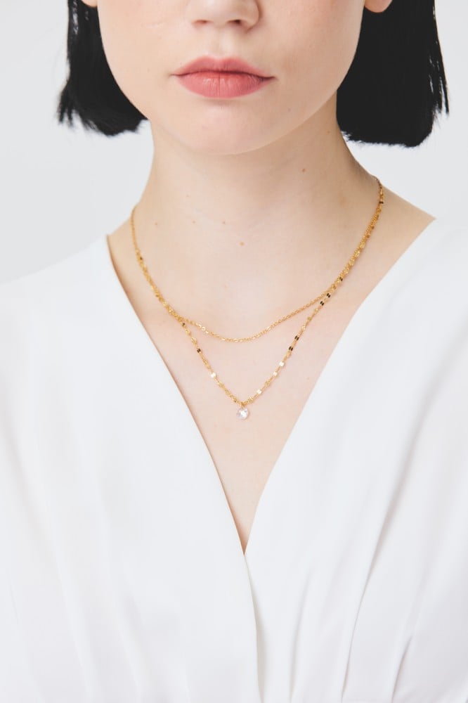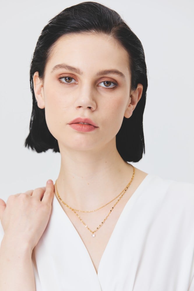 أضيفي لمسة أنثوية رقيقة إلى إطلالتك اليومية مع هذا السلسال الناعم بلون ذهبي وبتصميم طبقتين ومزين بتعليقة براقة