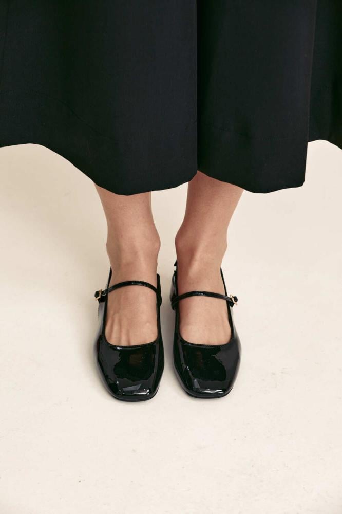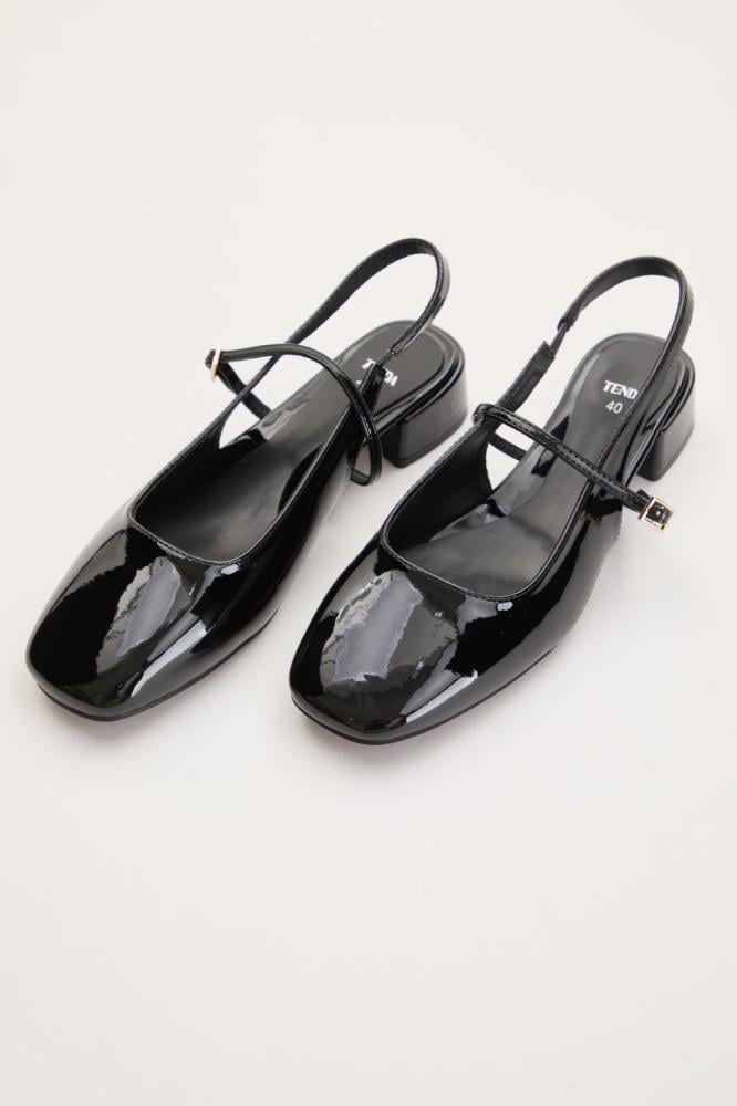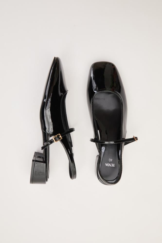 حذاء بالرينا مفتوح من الخلف يتميز بكعب عريض ،ويأتي الحذاء بمقدمة مربعة من الجلد اللامع ليضفي عليه لمسة مفعمة بالأنوثة، فضلاً عن أنها مصممة بسير رفيع بإبزيم لضبط المقاس المثالي.