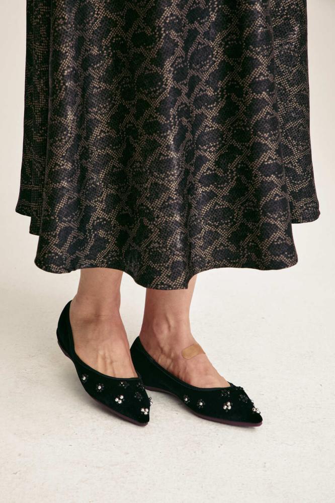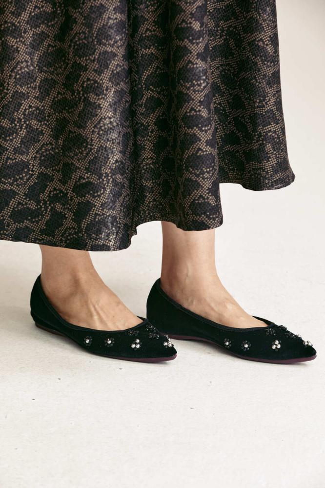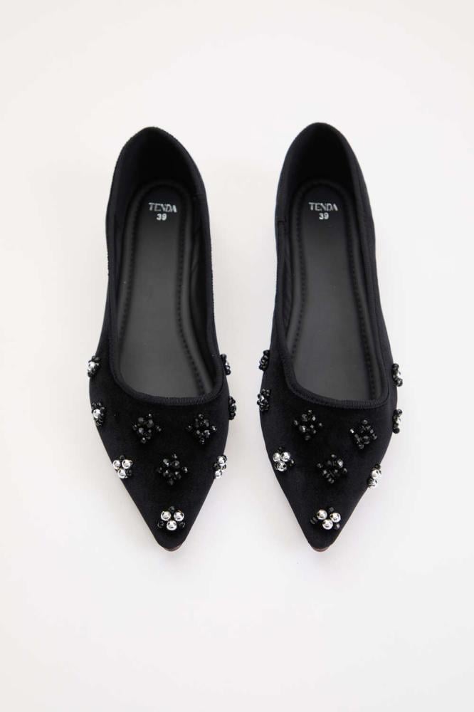 حذاء باليرينا أنيق ومريح يأتي بتصميم عملي ومفعم بالأنوثة مصنوع من قماش مخمل مزين بالخرز اللامع لإضفاء لمسة مميزة على التصميم.