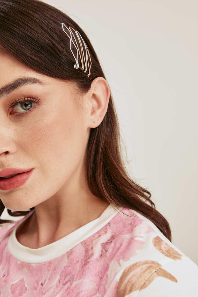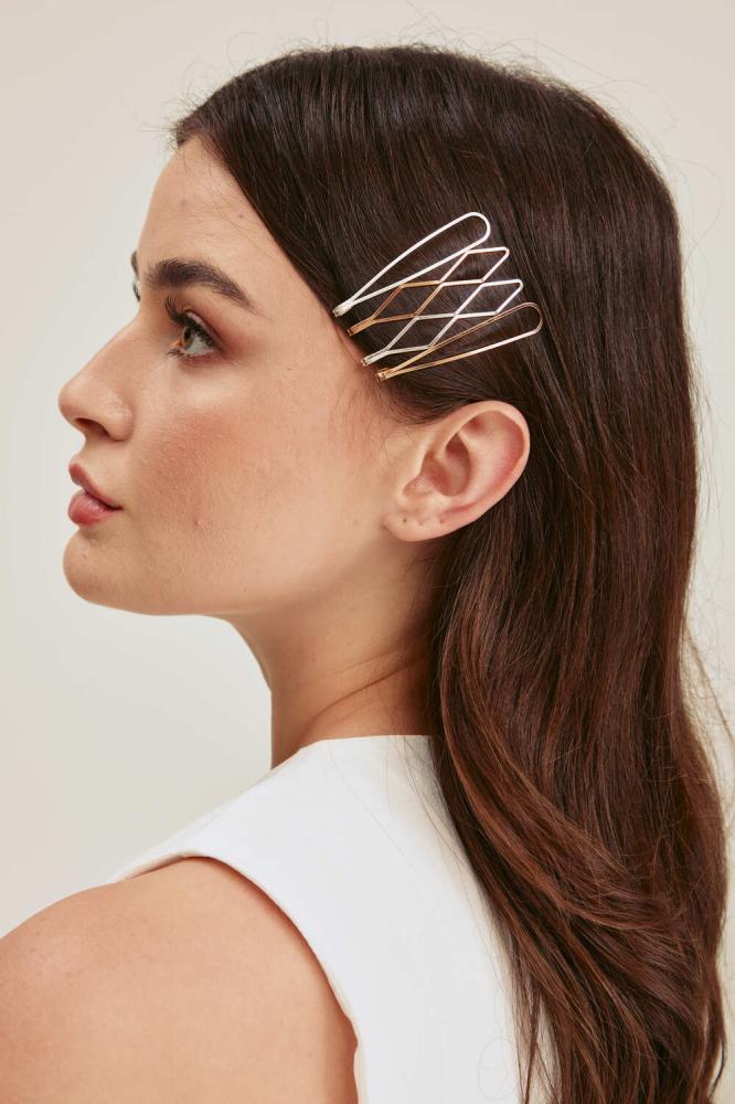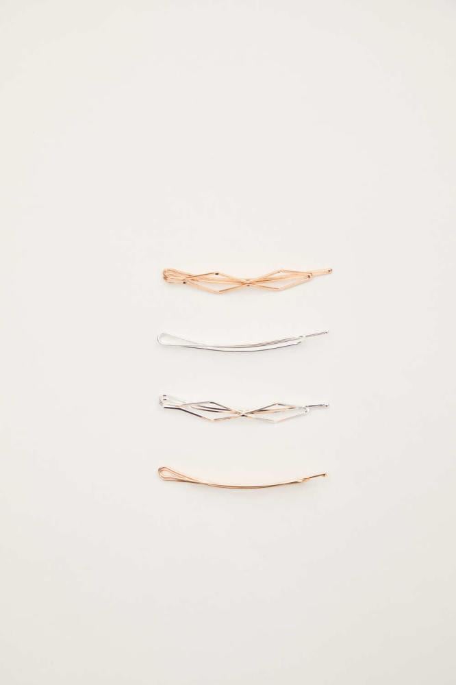 طقم مشبك شعر معدني(4 قطع) بتصميم هندسي أنيق، باللون الذهبي والفضي، مما يمنحها لمسة عصرية وبسيطة تناسب جميع الإطلالات.