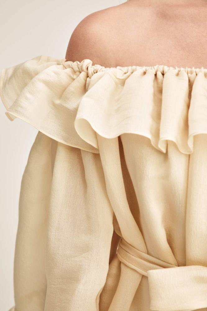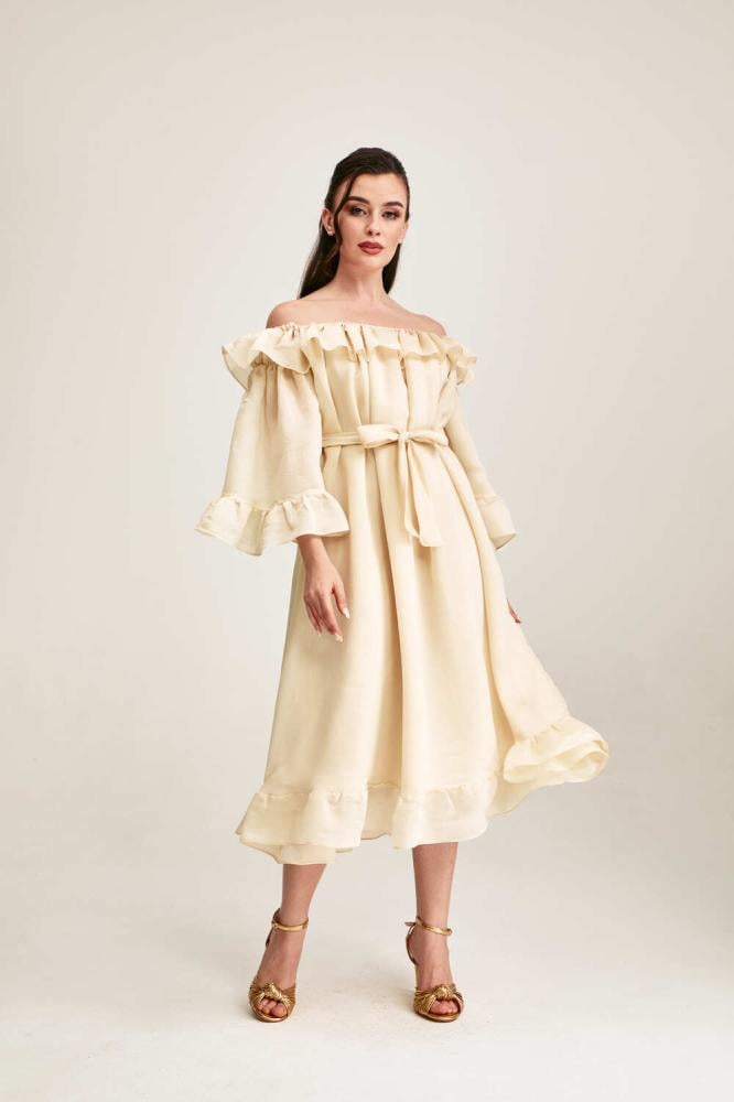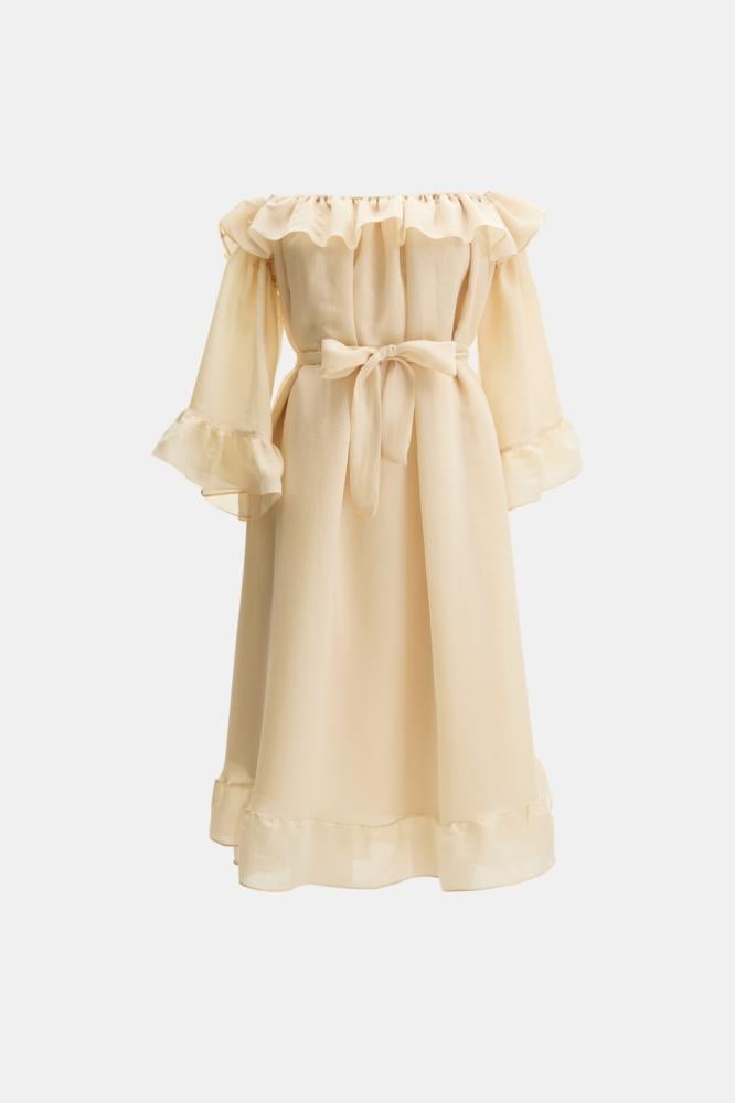 الكشكش والحزام القماشي يعززان جمالية القوام بأسلوب أنيق ومتوازن.