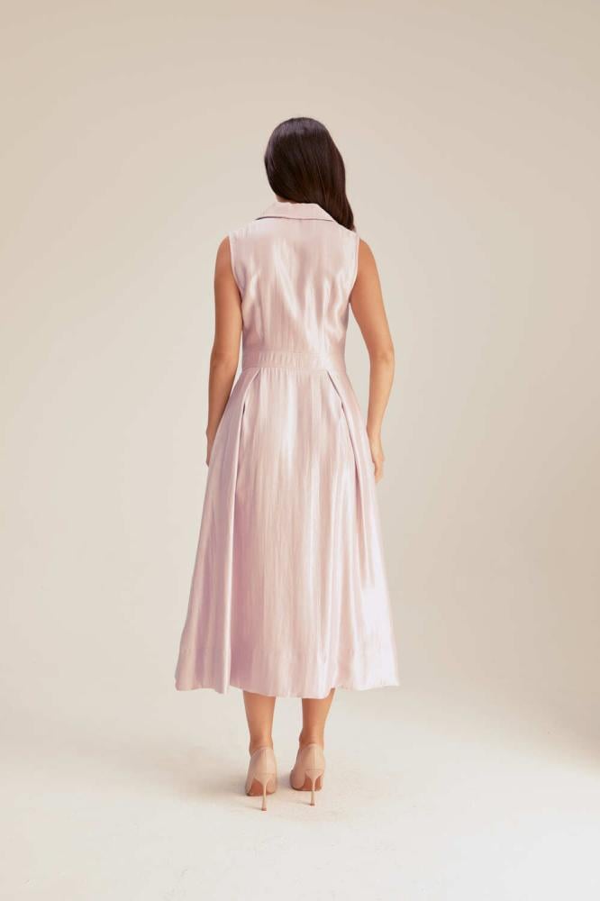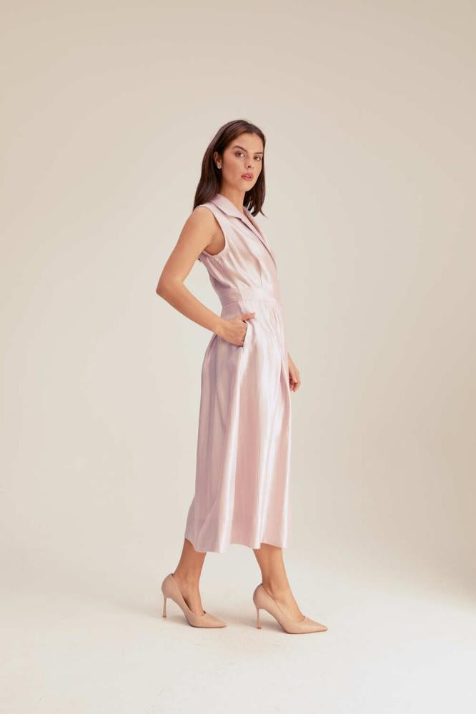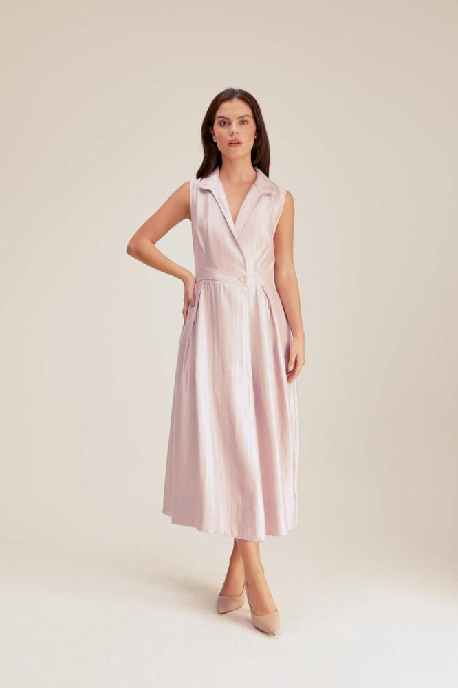 فستان أنيق بلمعة جذابة يعكس الفخامة بأسلوب راقٍ. يتميز بياقة عصرية بتصميم بنمط لف تضفي لمسة أنثوية جذابة، مع قصة A-line انسيابية لراحة وأناقة مثالية. يُغلق بزر جانبي أنيق ليكمل التفاصيل العصرية