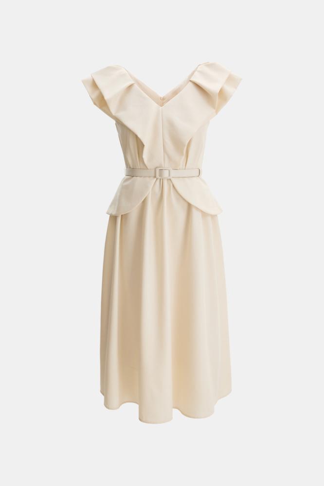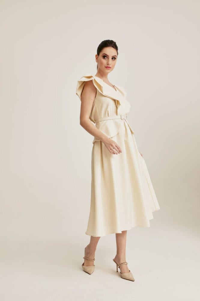لإطلالة استثنائية جذابة تألقي بفستان بتصميم قطعتين كشكش من أعلى وينسدل بتنورة واسعة ويأتي مع حزام يضفي لمسة فخمة ، نسقيه مع حذاء بكعب لمظهر مبهر