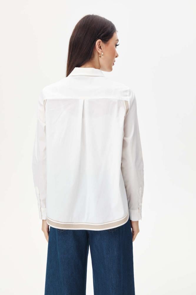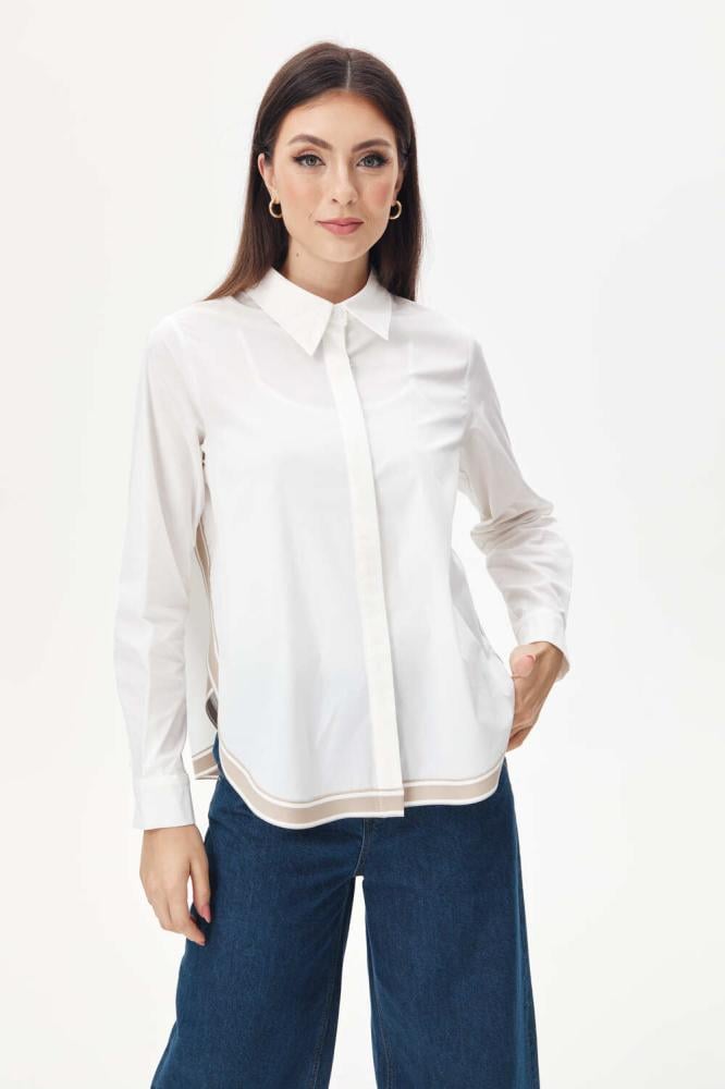 قميص يتميز بتصميم عملي مناسب للعمل، حيث يأتي بياقة مدببة تضيف لمسة رسمية، وأكمام طويلة بأزرار مخفية للإغلاق تمنحه مظهراً أنيقاً وانسيابياً. يتميز أيضًا بشريط مقلم مطاطي في الأسفل، يمكن تنسيقه بسهولة مع بناطيل رسمية أو كاجوال لإطلالة متكاملة تناسب بيئة العمل.