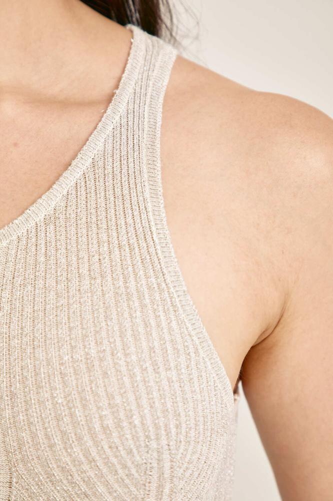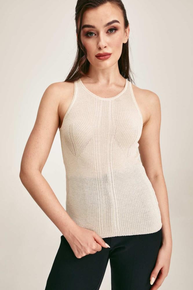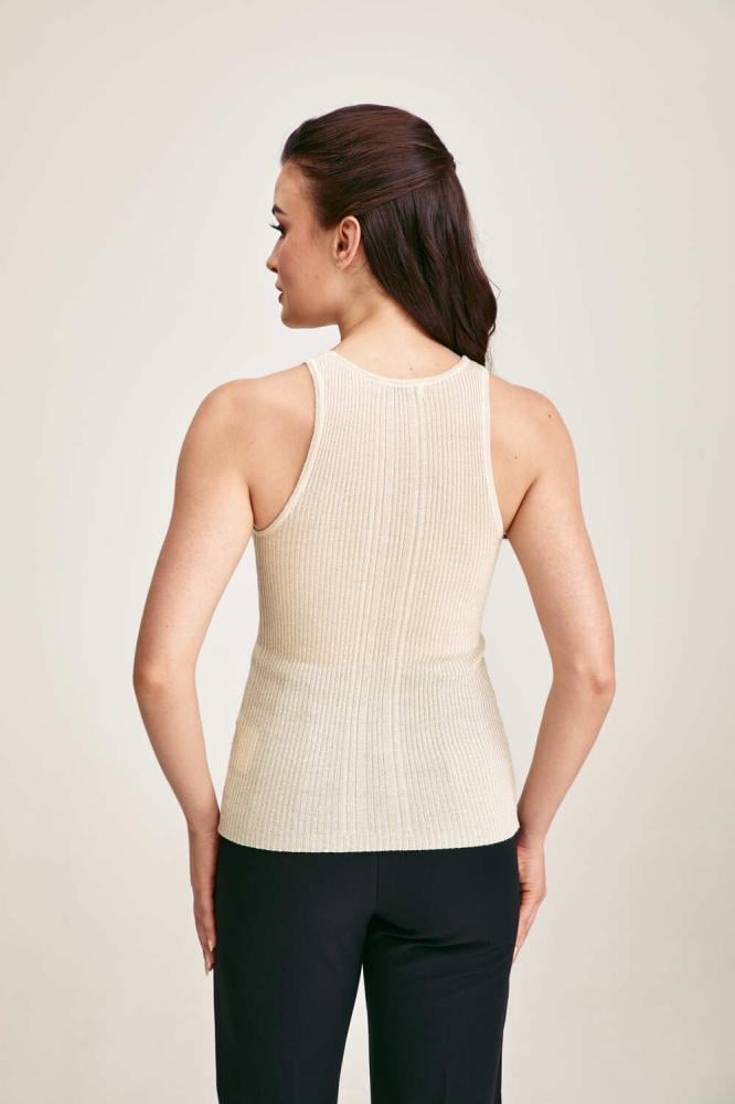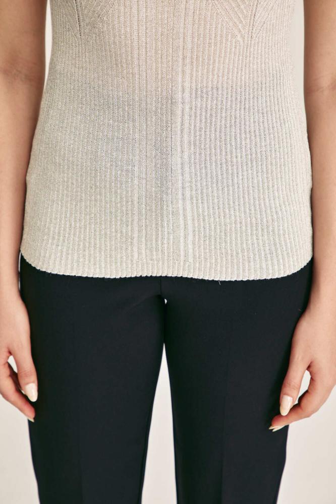 تتميز هذه البلوزة المحبوكة بتصميم بسيط وبياقة مستديرة وبلا أكمام، مما يجعلها مثالية للإرتداء تحت جاكيت لإطلالة شتوية متكاملة