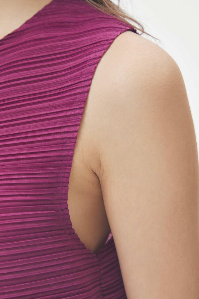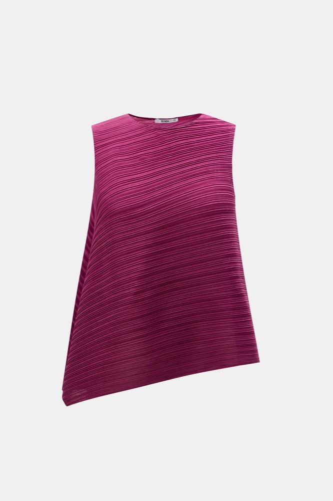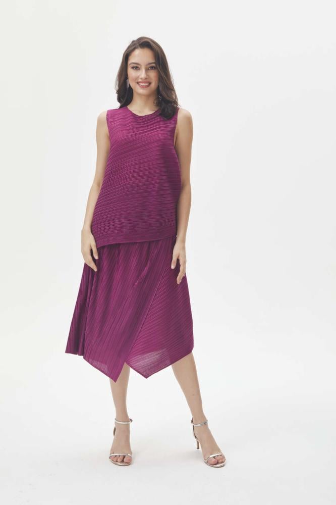 لمظهر متجدد وأنيق ، بلوزة بتصميم بياقة مستديرة وبدون أكمام وتأتي بقصة واسعة ، نسقيها مع تنورة بلون متناسقة للوك عصري