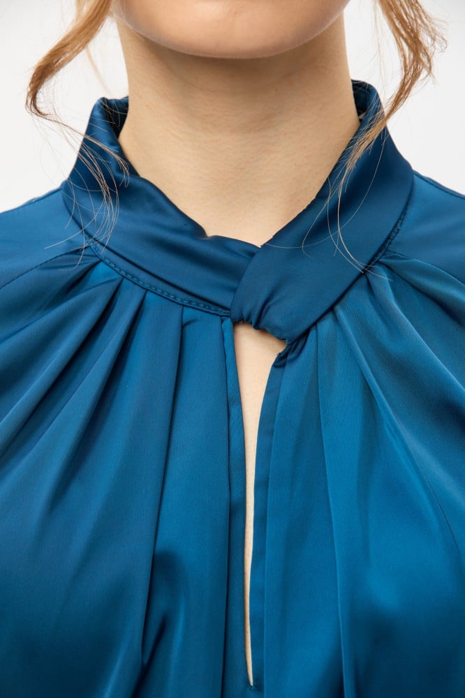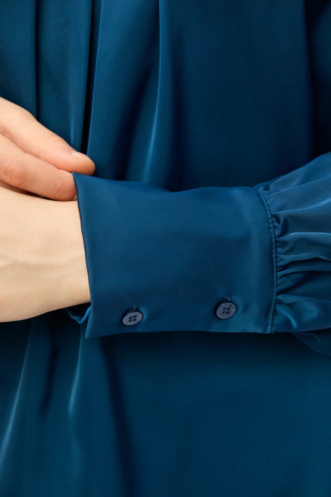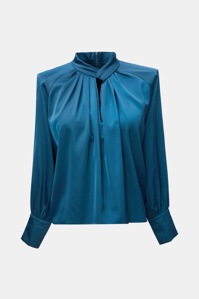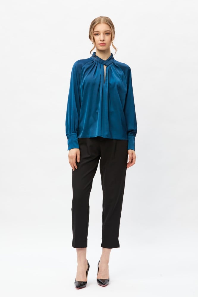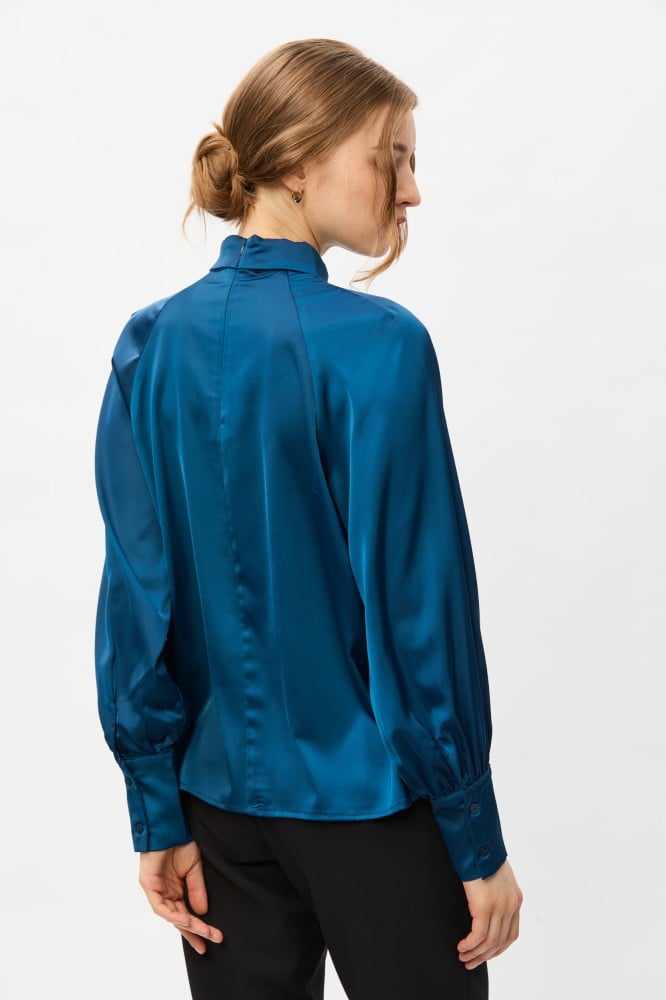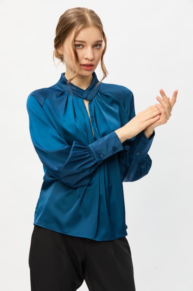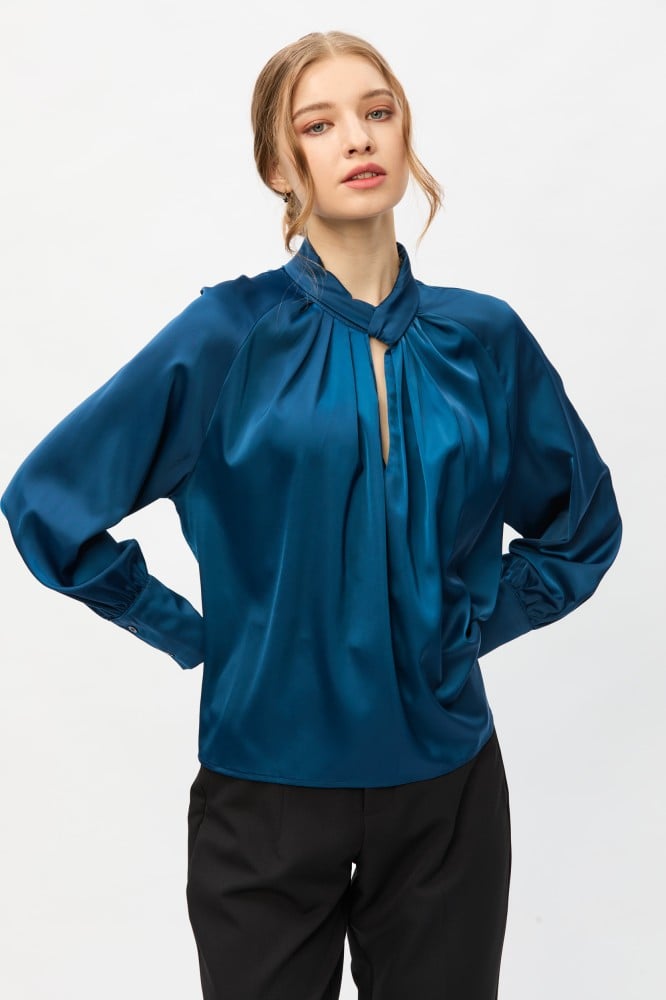 امنحي مظهركِ اليومي لمسة من الأناقة والجاذبية مع هذة البلوزة الناعمة ، بتصميم بياقة مرتقعة وبأكمام ريجلان ، وتتميز بتفاصيل كسرات تضفي عليها لمسة انثوية جذابة ، ارتديها مع بنطلون بخصر عالي لمظهر أنيق