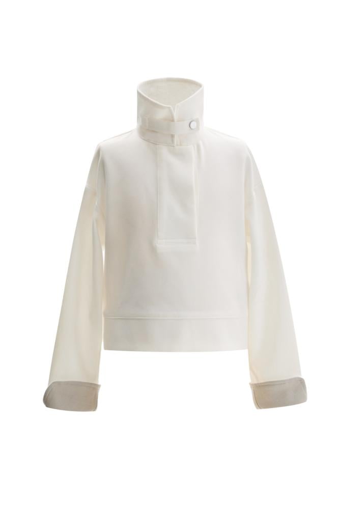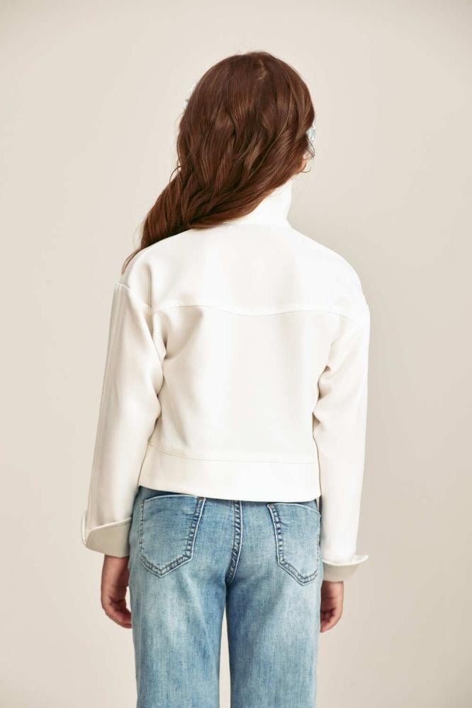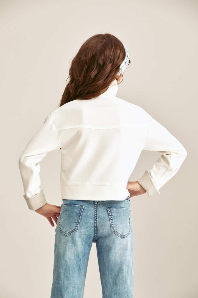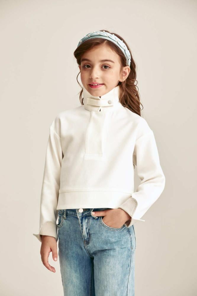 بلوزة مميزة بياقة قابلة للتعديل لتختاري بين ياقة عالية أو ياقة قميص، مزودة بزر كبس للإغلاق وأكمام طويلة بثنية تضيف لمسة عصرية أنيقة لإطلالتك صغيرتك اليومية.