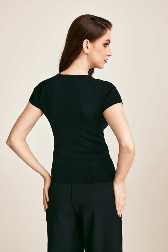 بلوزة بأكمام قصيرة مصنوعة من قماش مطاطي ناعم، بقصّة ضيّقة تبرز القوام، مثالية للإطلالات اليومية أو تنسيقات العمل.