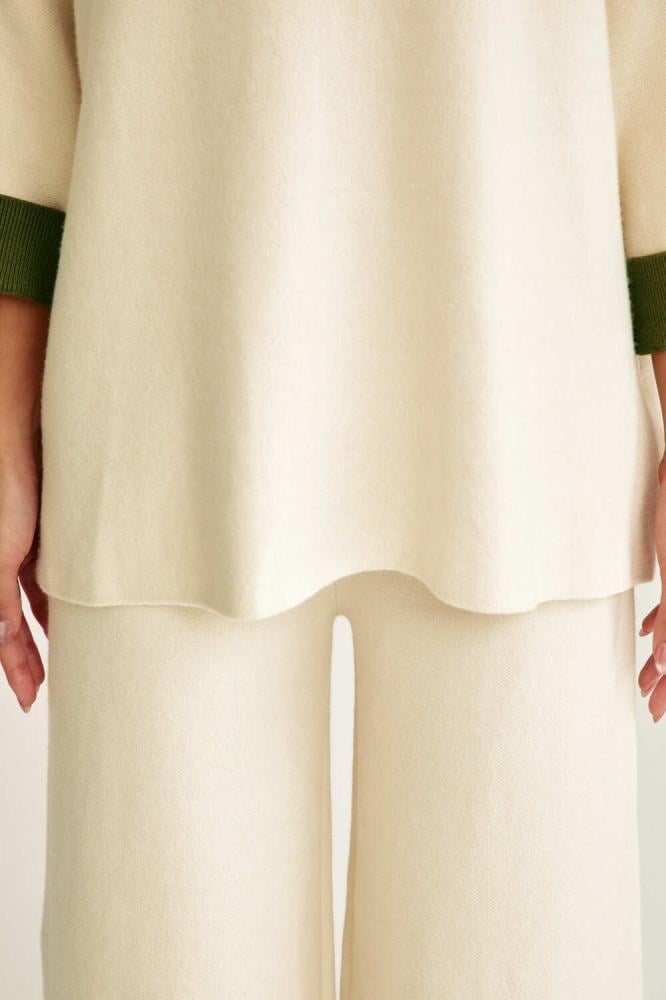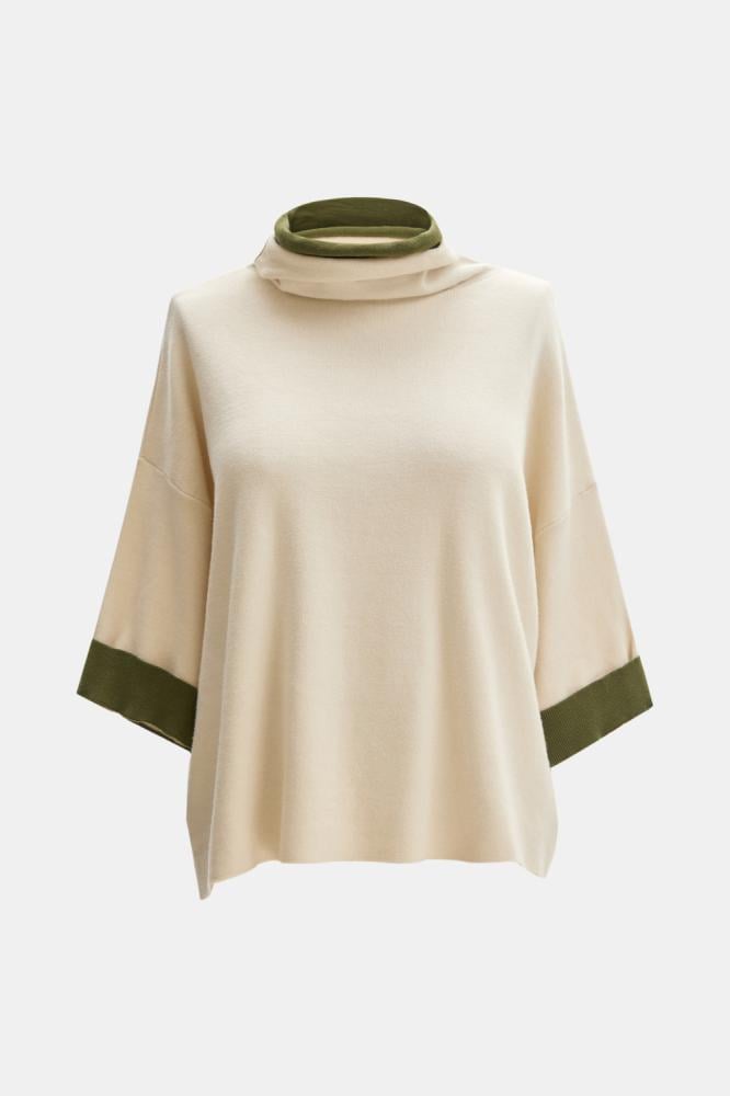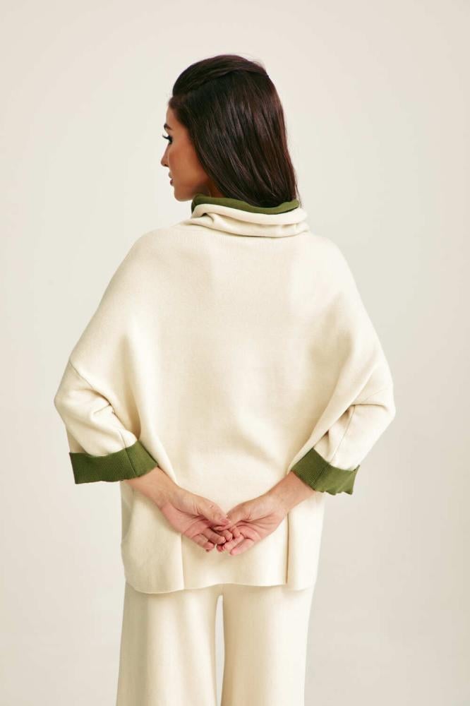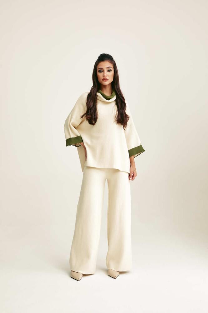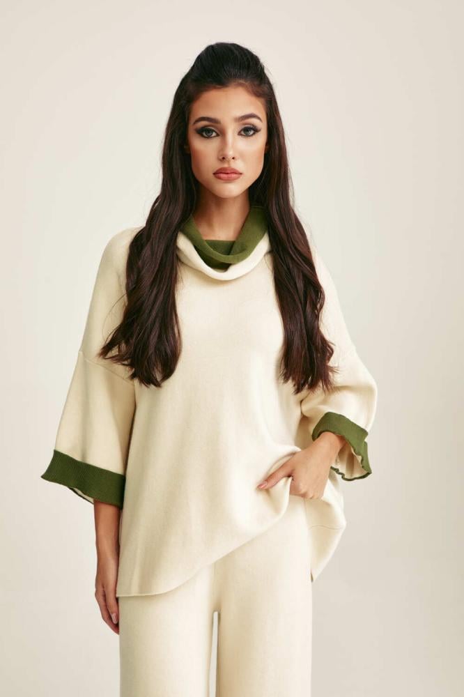 تمتعي بالدفء والأناقة هذا الشتاء وانتقي بلوزة بياقة عالية مزدوجة ، وبأكمام بثنية بلون مغاير وتأتي بقصة واسعة ، نسقيها مع بنطلون بتصميم مماثل للوك عصري مذهل