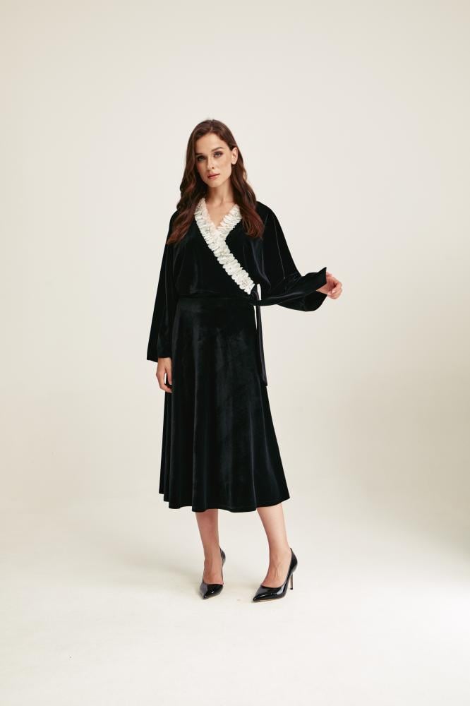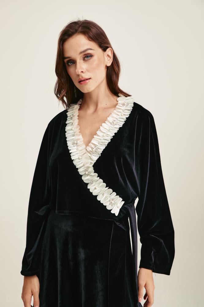 لمناسباتك المسائية الأنيقة، بلوزة مصممة بقصة مفعمة بالأنوثة وتتميز بياقة لف برباط جانبي وتتزين بكشكش بتفاصيل لؤلؤ وأحجار براقة.