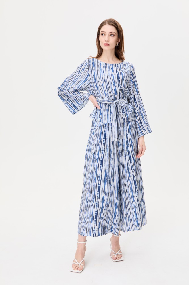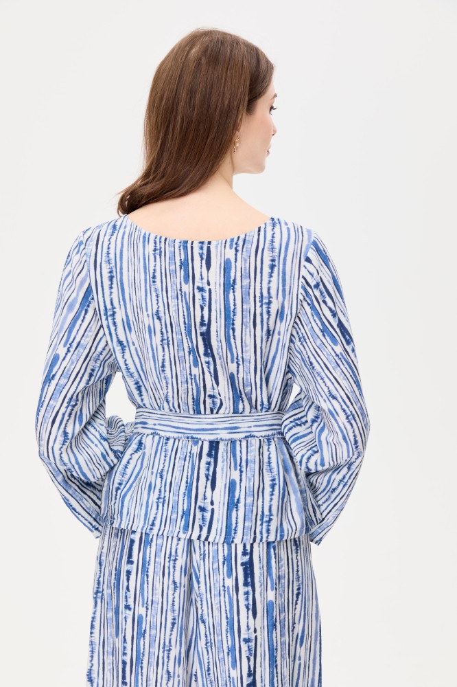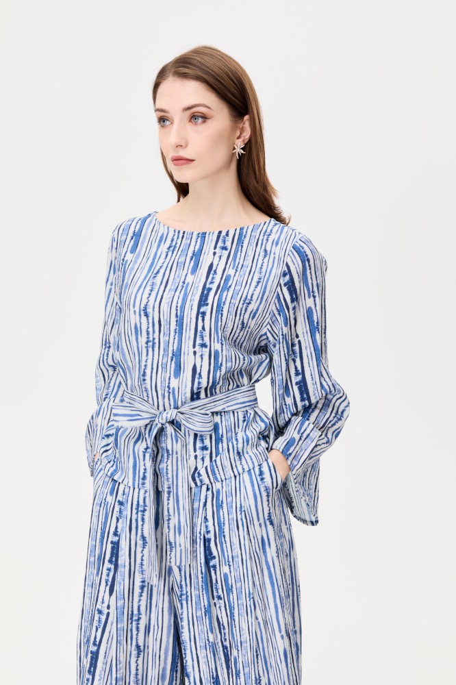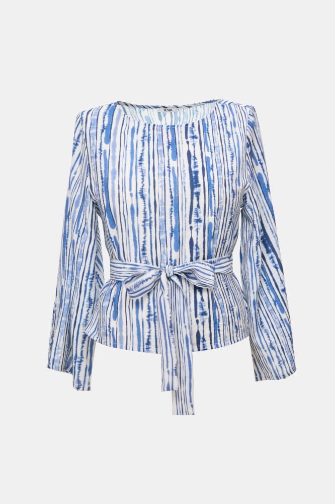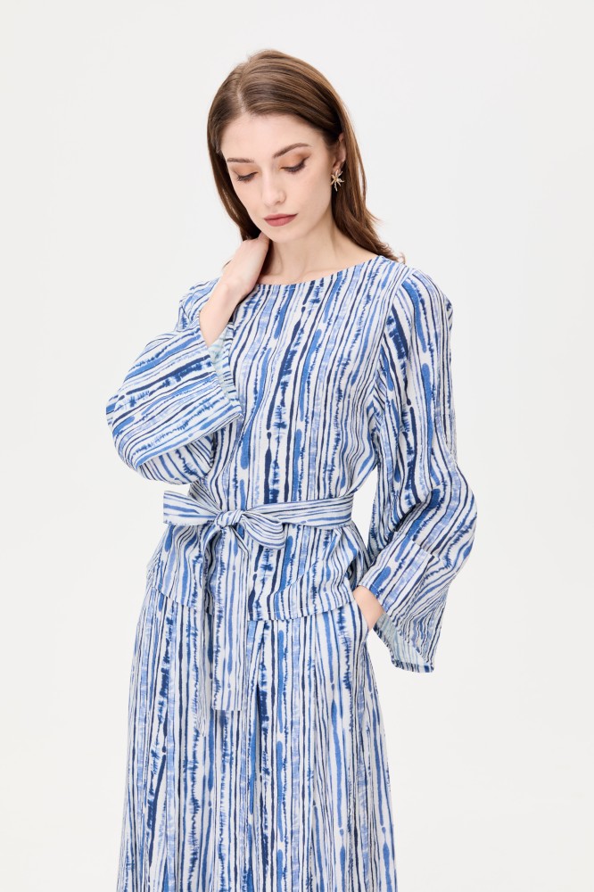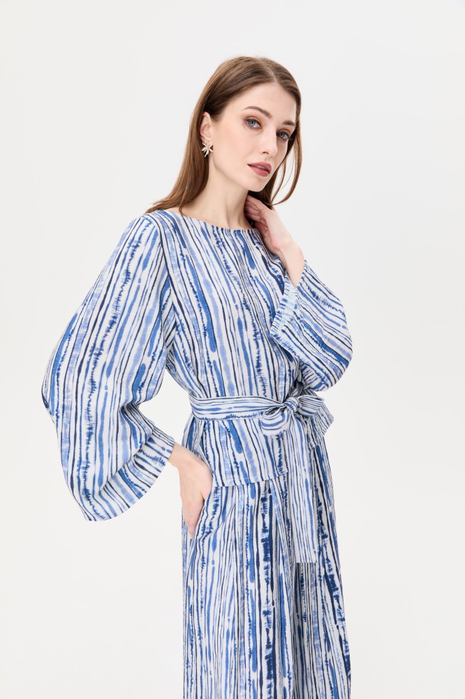 لإطلالة مميزة وأنيقة أختاري هذه البلوزة الناعمة ، مزينة بطبعات مخططة بتصميم بياقة مستديرة وبأكمام طويلة وتأتي مع حزام ربط من نفس الخامة ارتديها مع بنطلون للوج جذاب