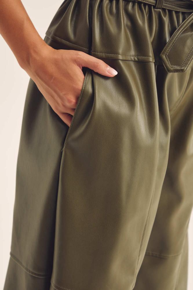 بنطلون جلد فخم بتصميم عصري، يتميز بأرجل واسعة وخصر مطاطي يعزز من أناقتك و يأتي بحزام ربط أنيق لإضفاء لمسة من التميز والتفرد على إطلالتك