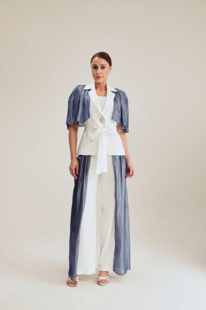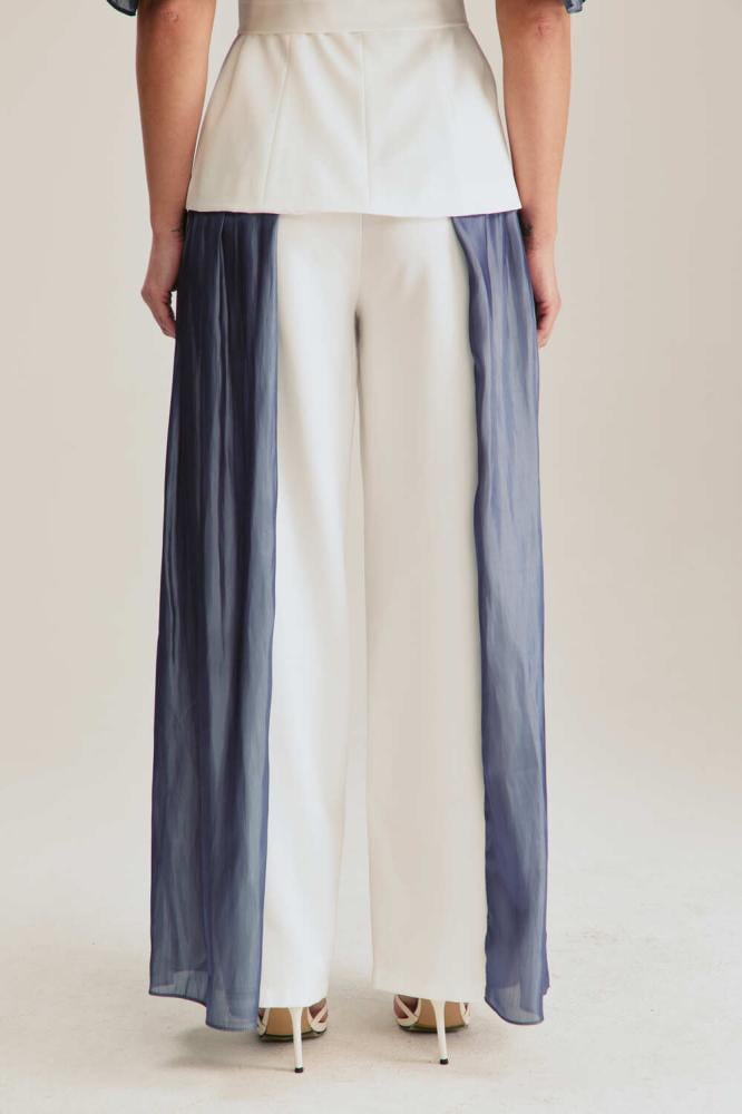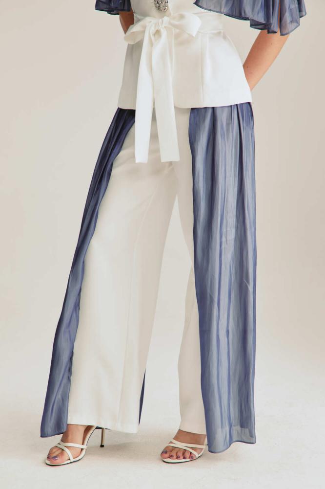 بنطلون عصري بخصر مرتفع يعزز الإطلالة الأنيقة، بتصميم أرجل واسعة لإحساس بالراحة والفخامة. يتميز بتفاصيل طيات وقماش بلون مغاير يضفي لمسة فريدة وعصرية.