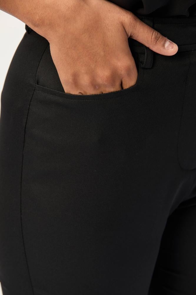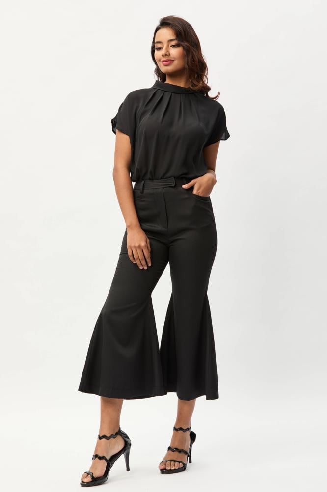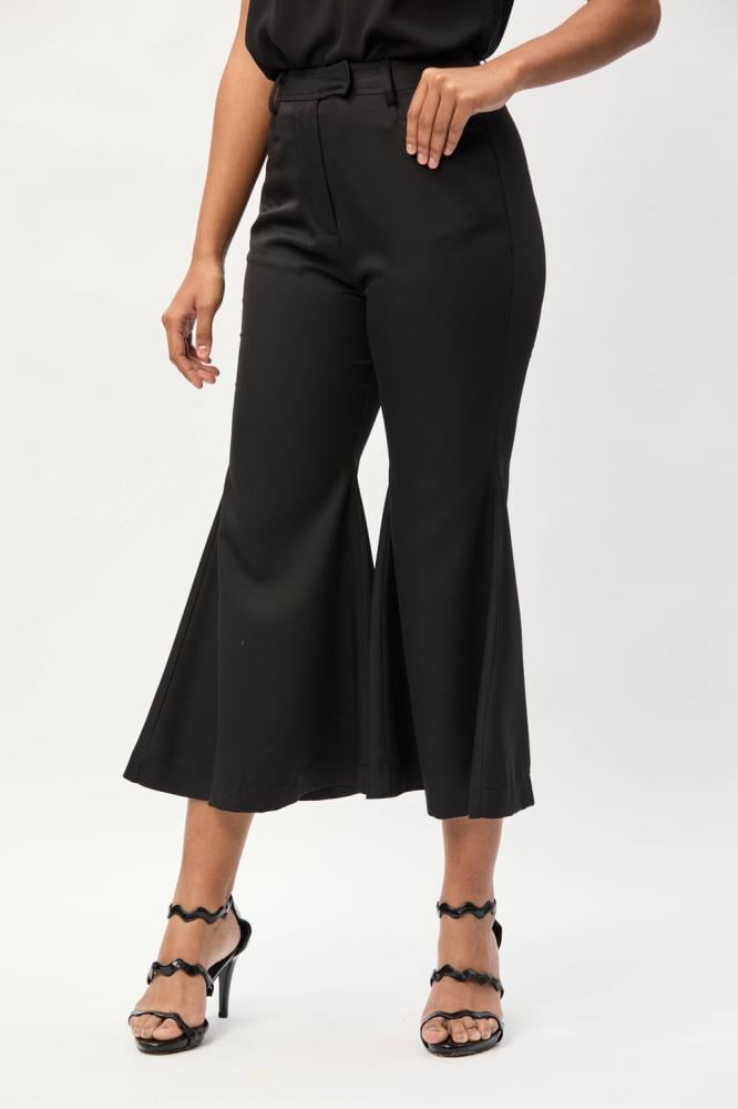 بنطلون أنيق بقصة ساق واسعة من الأسفل تجمع بين الطابعين الكلاسيكي والعصري. ويتميز بخصر مرتفع وبجيوب وسحاب مخفي للإغلاق ، نسقية مع جاكيت لإطلالة كلاسيكية ساحرة.