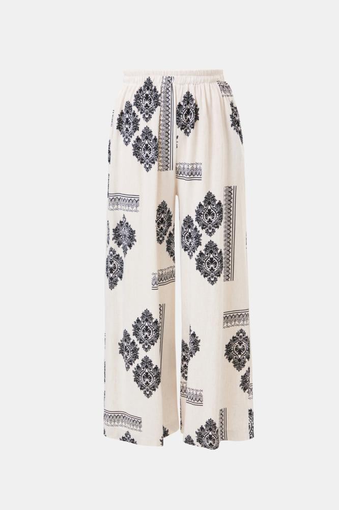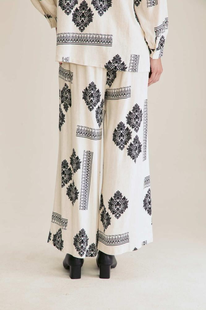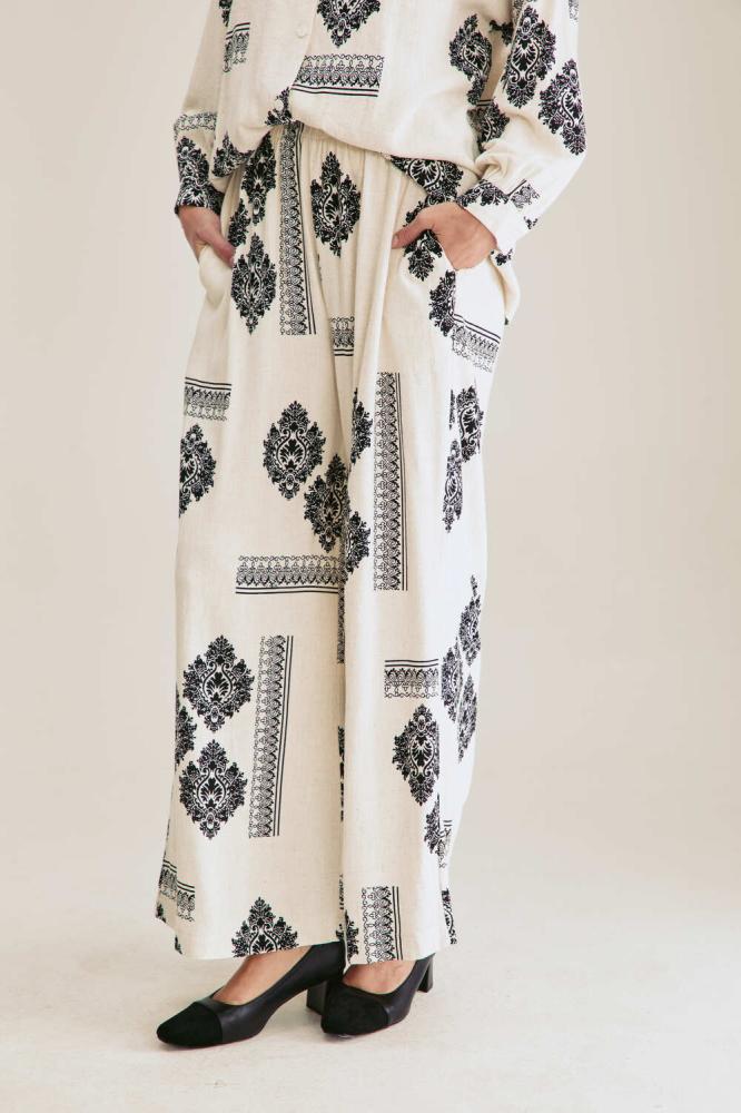 بنطلون مزين بنقوش كلاسيكية مصمم بقصة واسعة وبخصر مطاطي ، نسقيه مع بلوزة بتصميم مماثل لمظهر أنيق