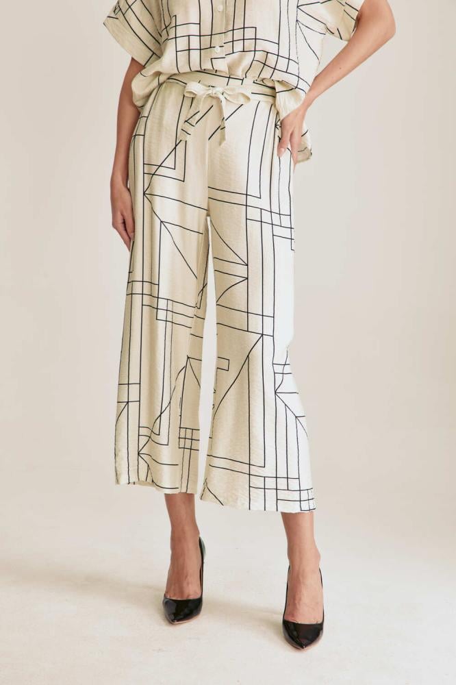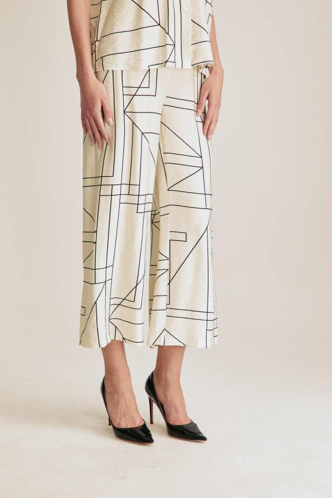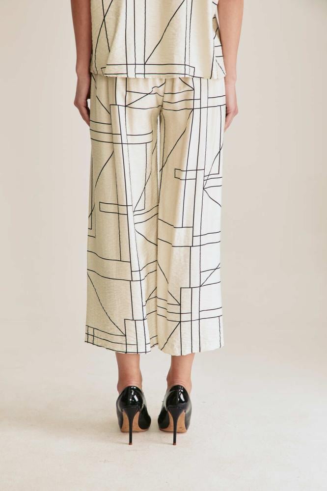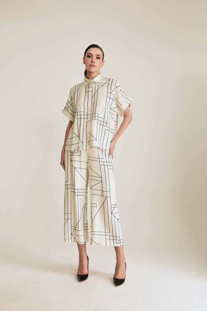 بنطلون مزين بنقوش هندسية مصمم بقصة واسعة وبخصر مطاطي بحزام ربط ، نسقيه مع بلوزة بتصميم مماثل لمظهر أنيق