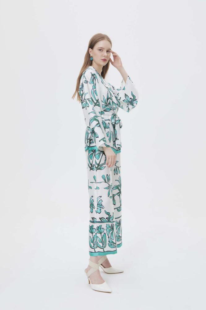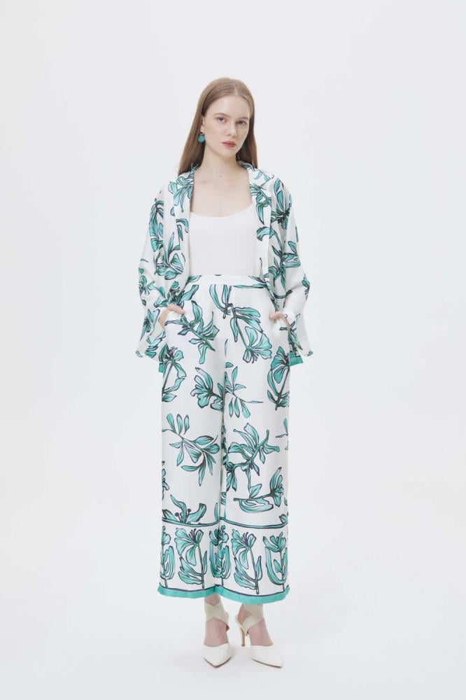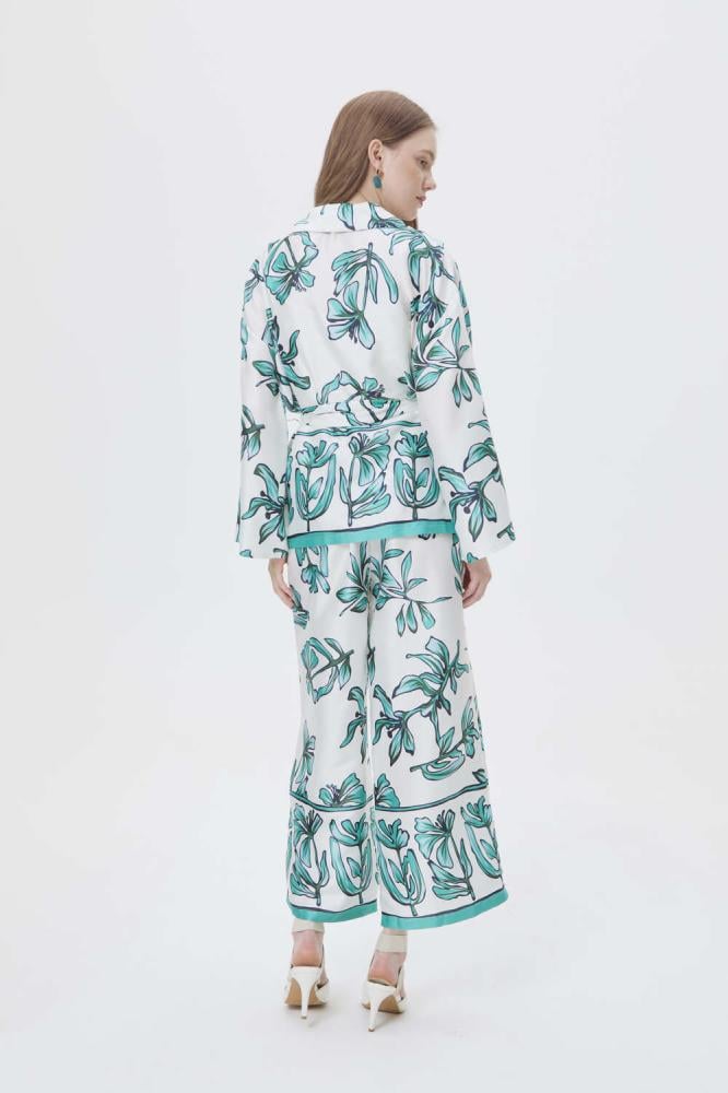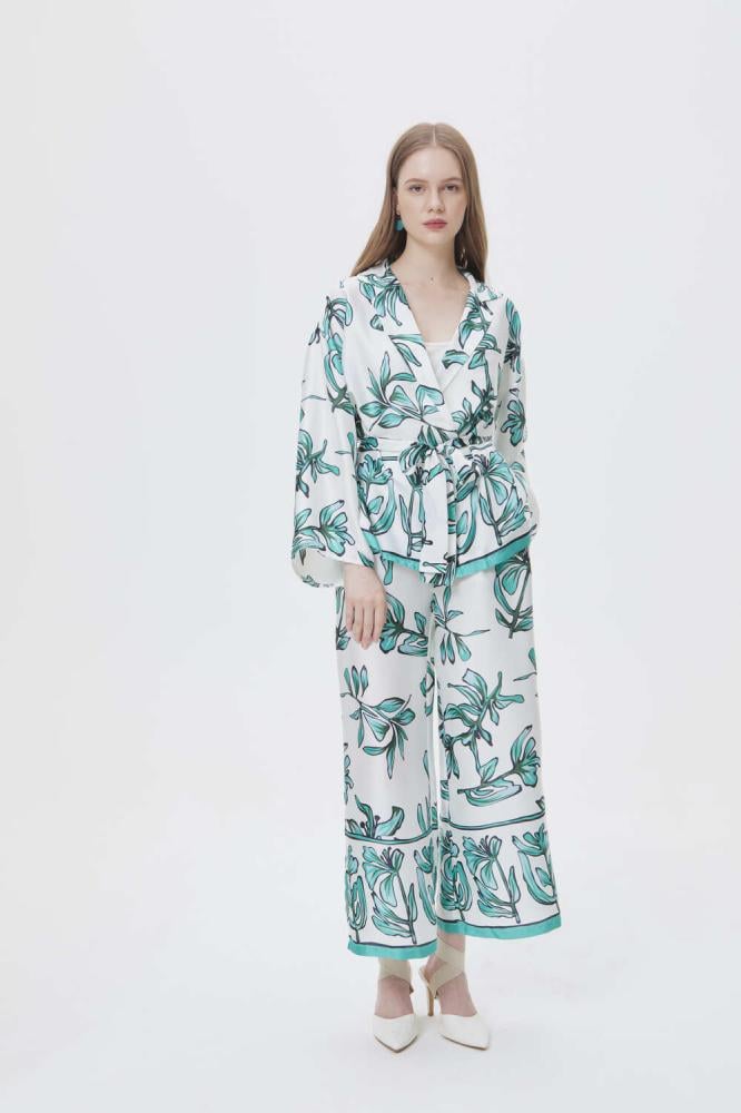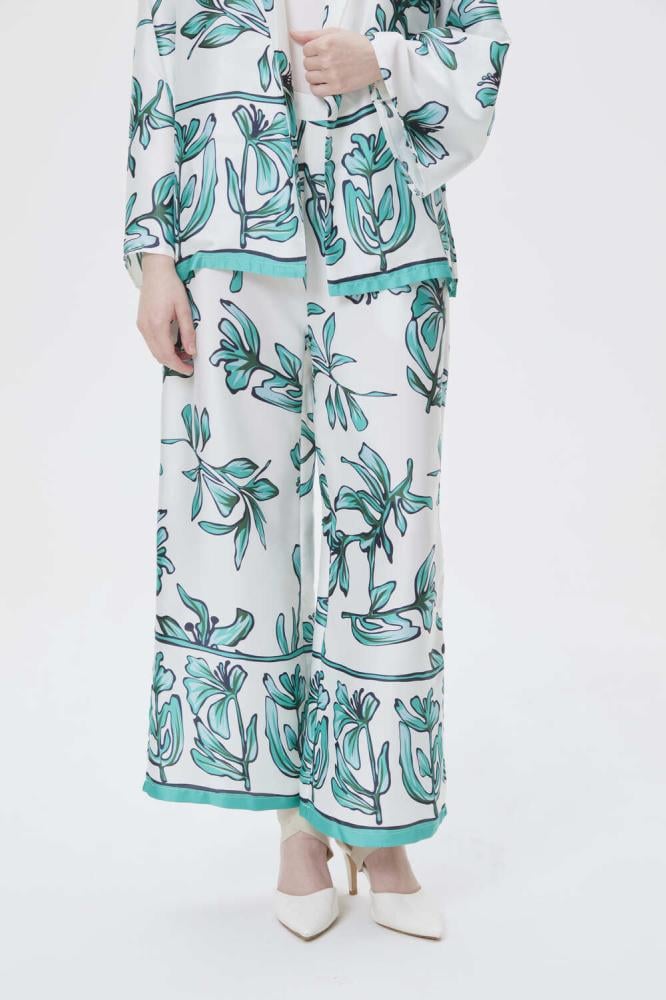 تألقي بأسلوب ناعم وعصري مع هذا البنطلون الأنيق بنقشة موردة ، يتميز بخصر مرتفع وأرجل واسعة ، كما أنه مصنوع من نسيج ناعم ومريح للغاية يمكن تنسيقه مع جاكيت بتصميم مماثل للوك لافت