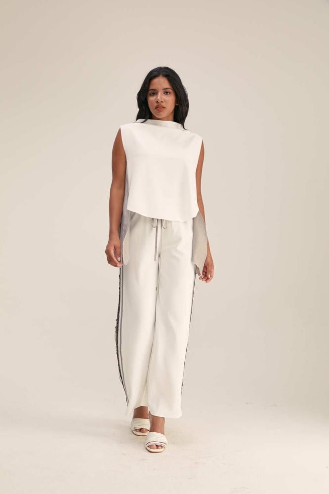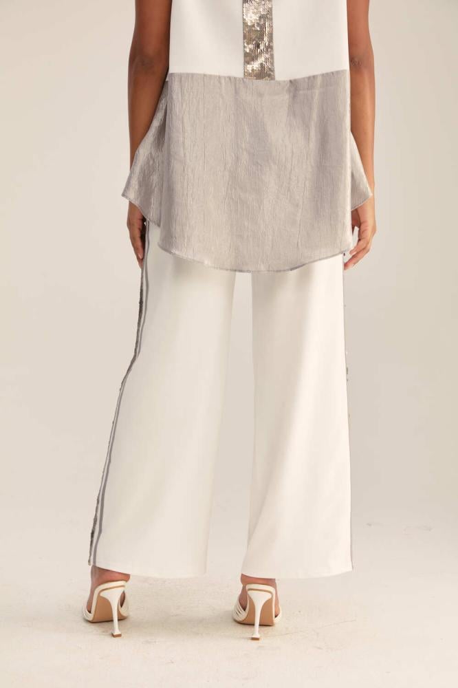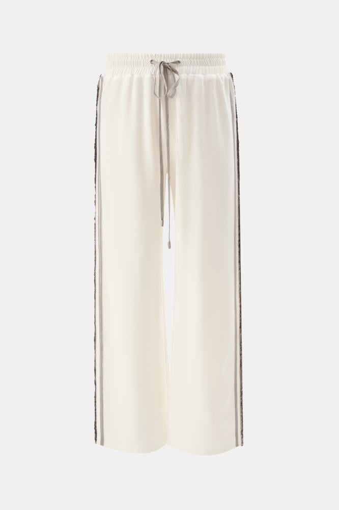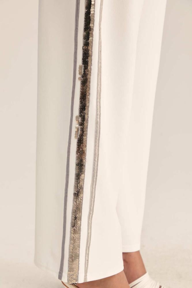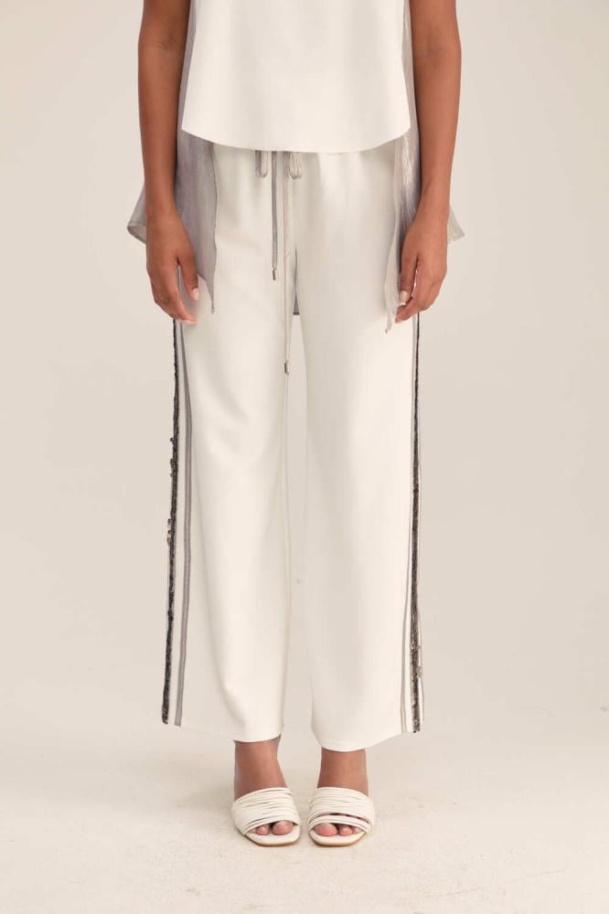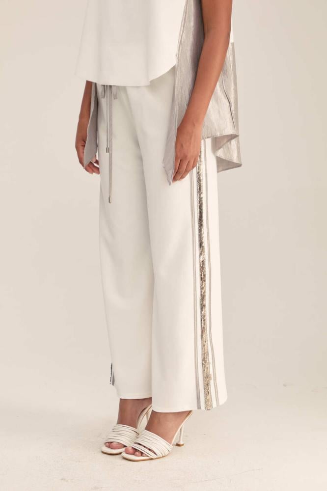 بنطلون بخصر مطاطي مريح مع رباط قابل للتعديل، بتصميم واسع الأرجل لإطلالة أنيقة وعملية. يتميز بشريط ترتر ليجمع بين البساطة واللمسة الجذابة.