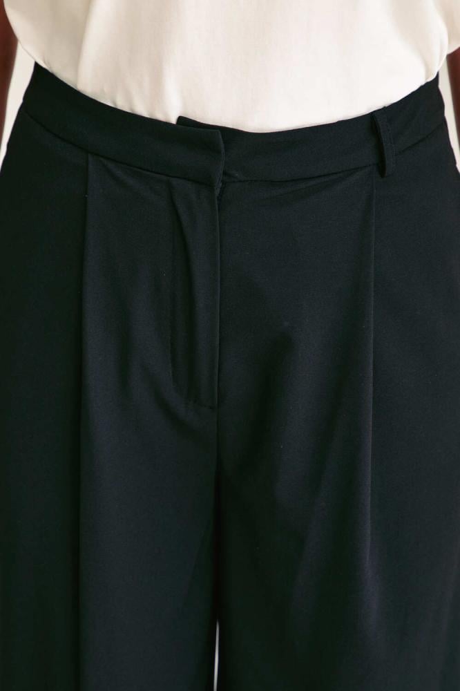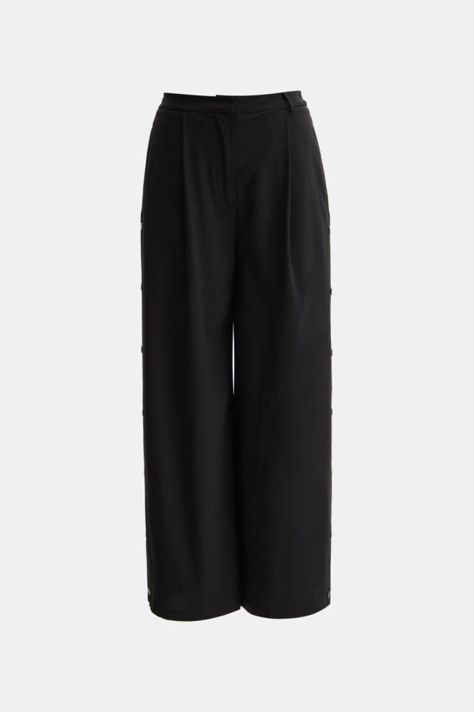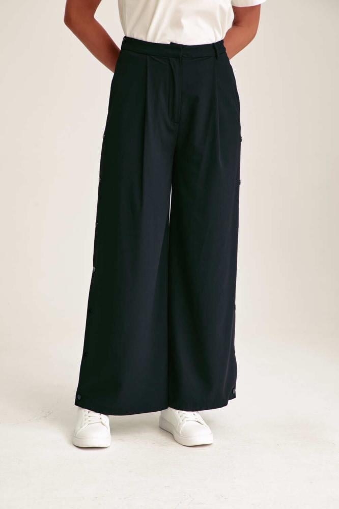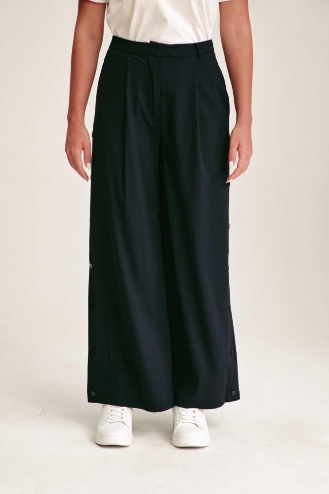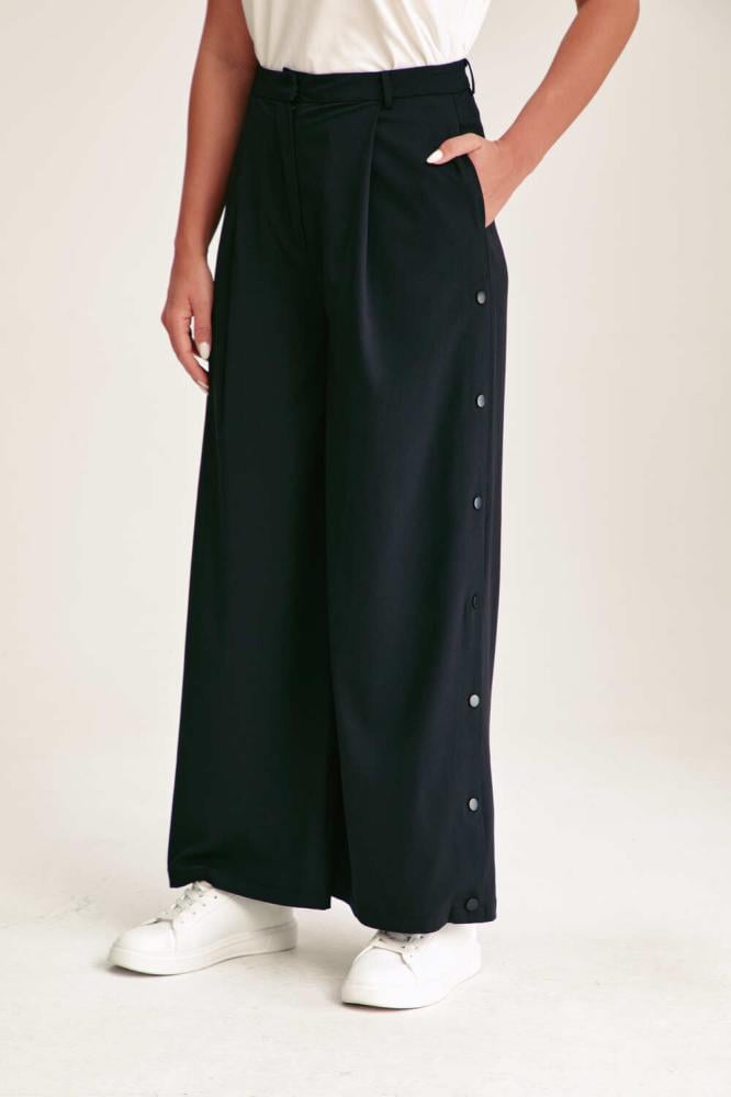 بنطلون أنيق بخصر مرتفع مع زر إغلاق وسحاب أمامي، تصميم بأرجل واسعة يزدان بأزرار كبس جانبية تمنحه لمسة عصرية ملفتة.