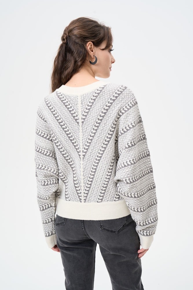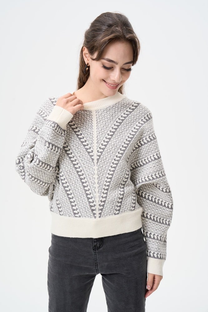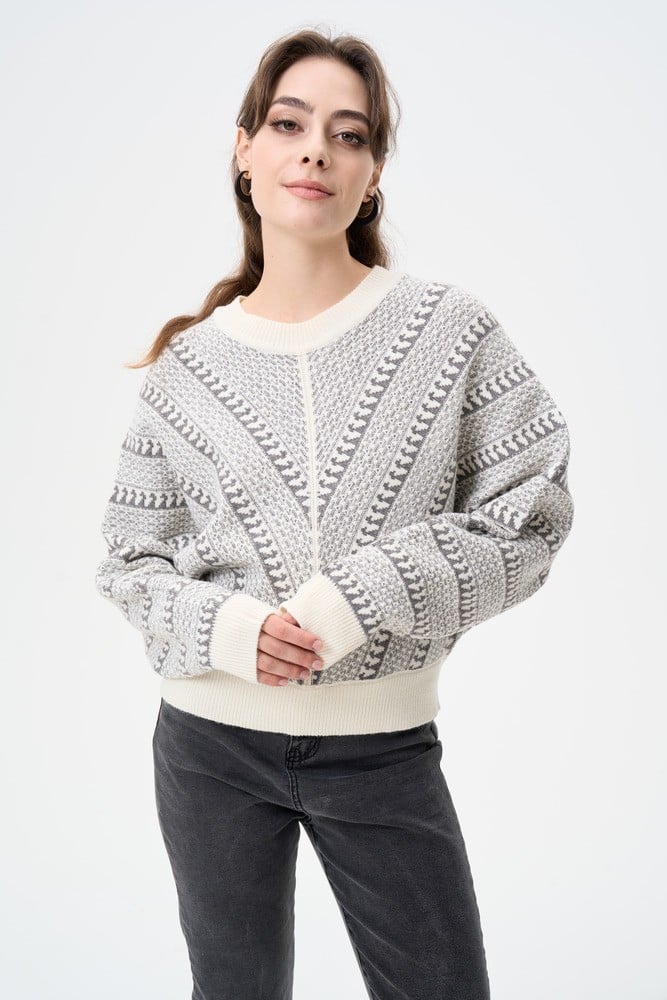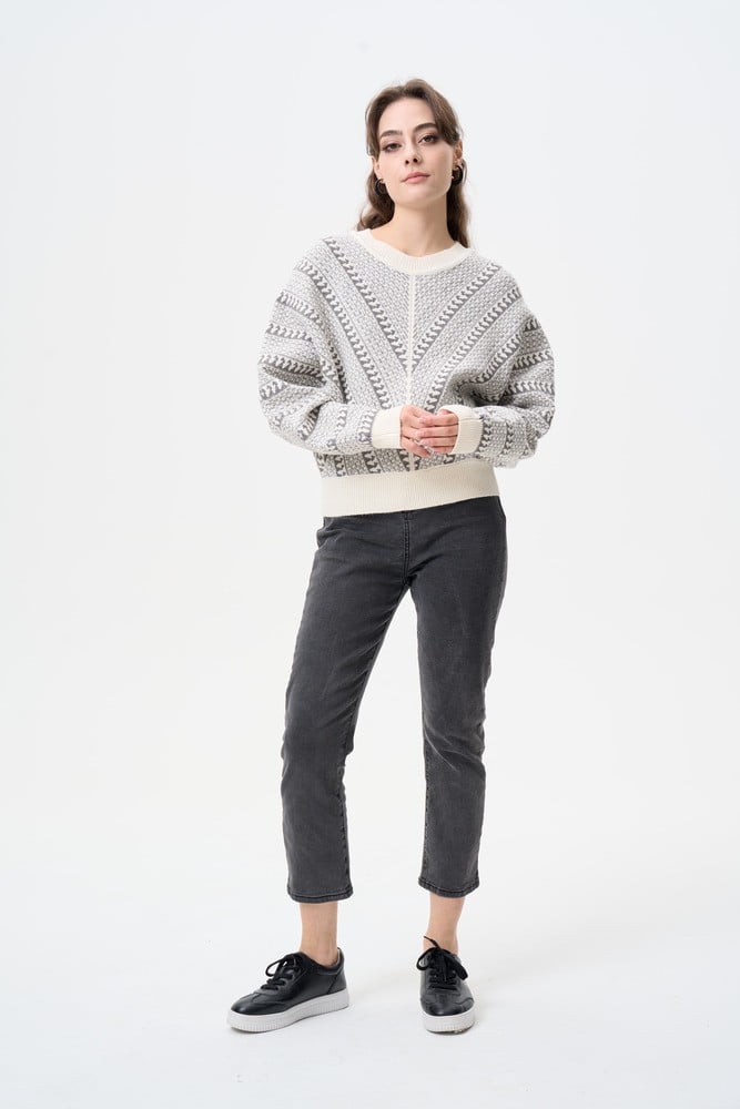 هذه البلوزة المحبوكة ستجمع لكِ بين الراحة والمظهر العصري الأنيق. مصممة بياقة مستديرة وبأكمام طويلة ومزدانة بنقوش مميزة ، يمكنك ارتداؤها مع بناطيل كاجوال لمظهر عملي