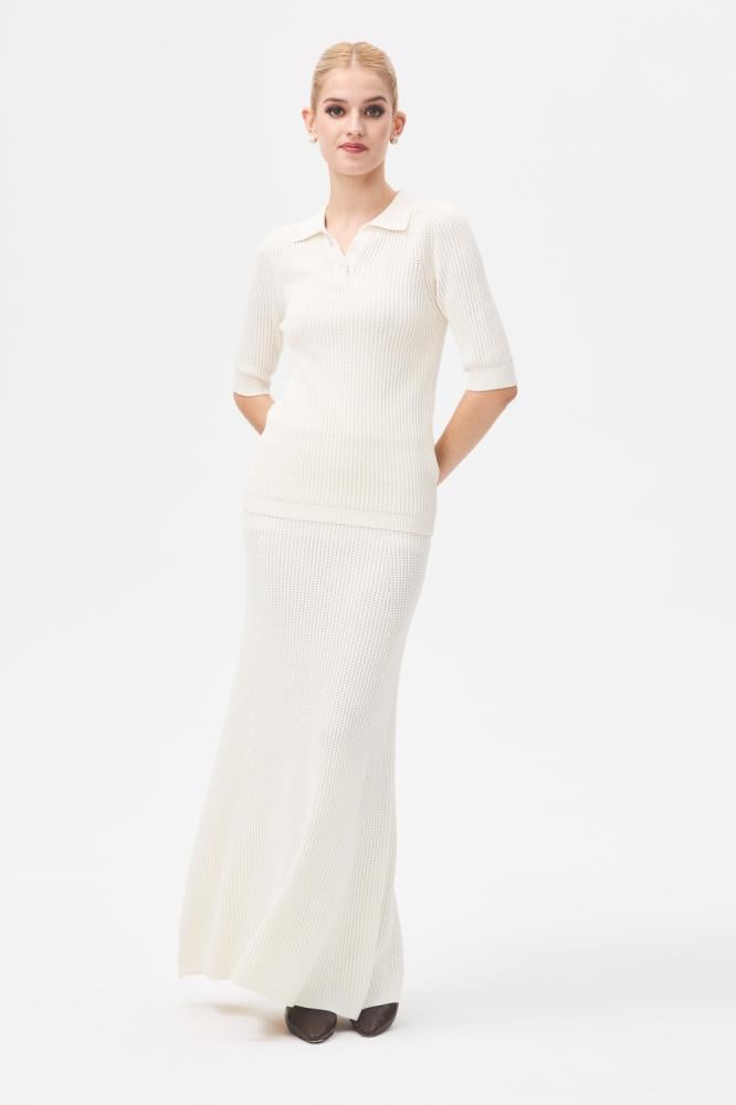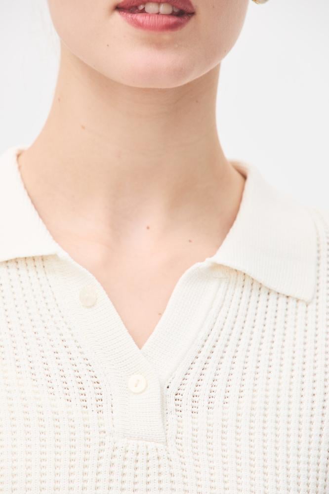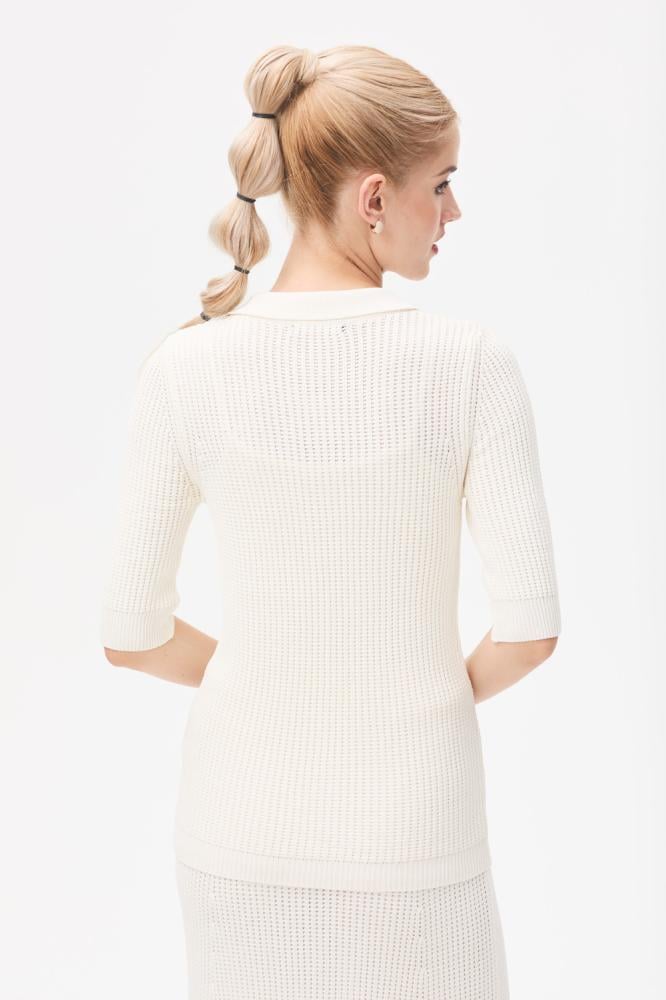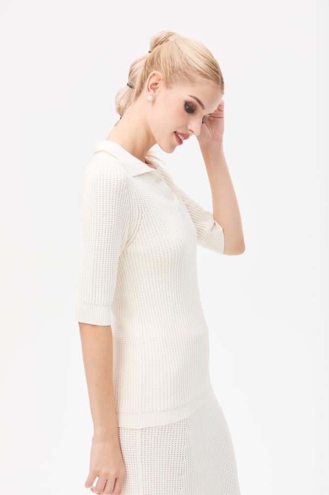 بلوزة محبوكة تناسب مختلف إطلالاتك ، بتصميم كلاسيكي بياقة بولو و بأكمام قصيرة ، يمكن تنسيقها مع تنورة مماثلة لإطلالة مريحة.
