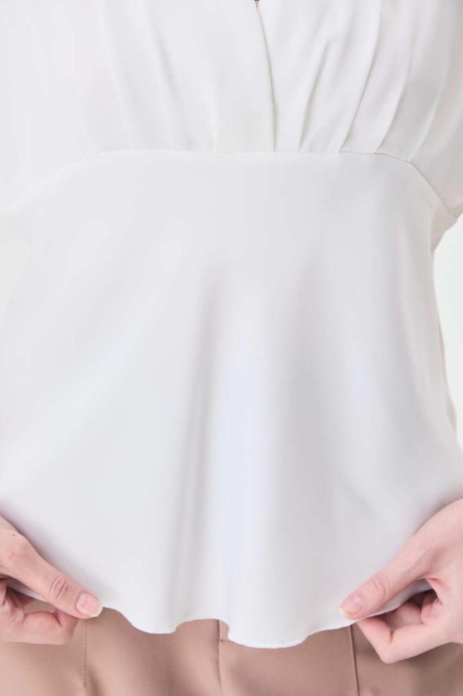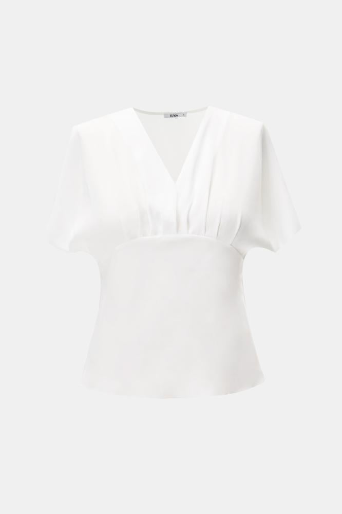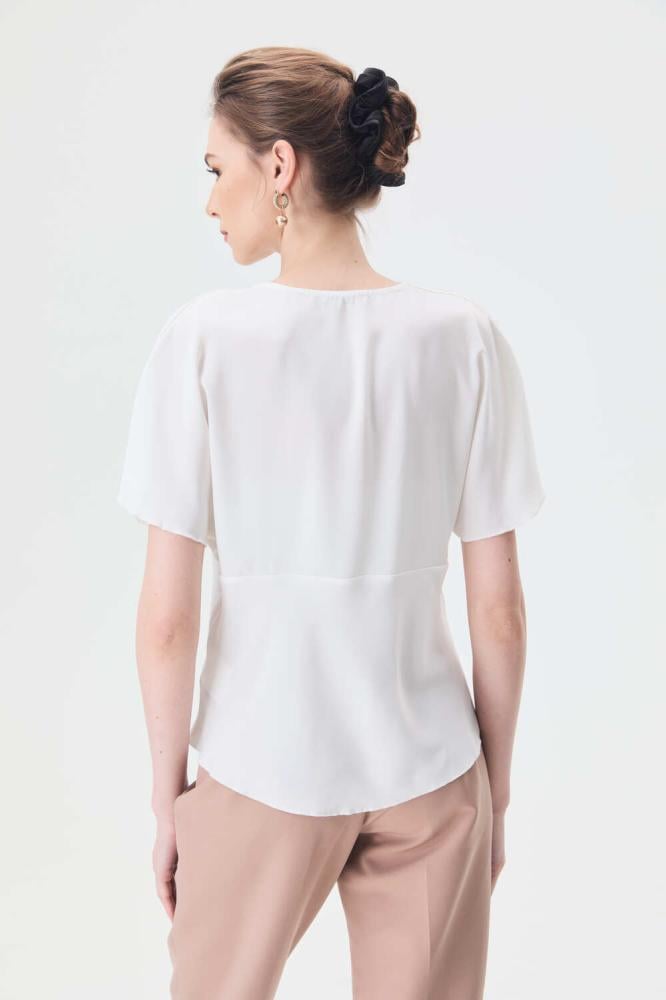 هذا القميص يتميّز بقماش ناعم وانسيابي، وقصّة واسعة تبرز الخصر ، مع ياقة V وأكمام قصيرة بأطراف منسدلة تمنحه لمسة أنثوية هادئة. مثالي للإطلالات الأنيقة والبسيطة في آنٍ واحد.