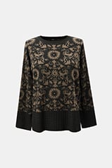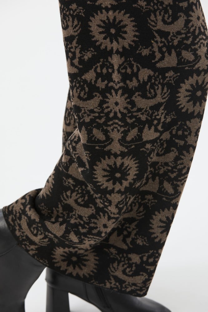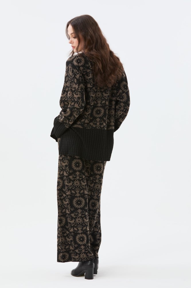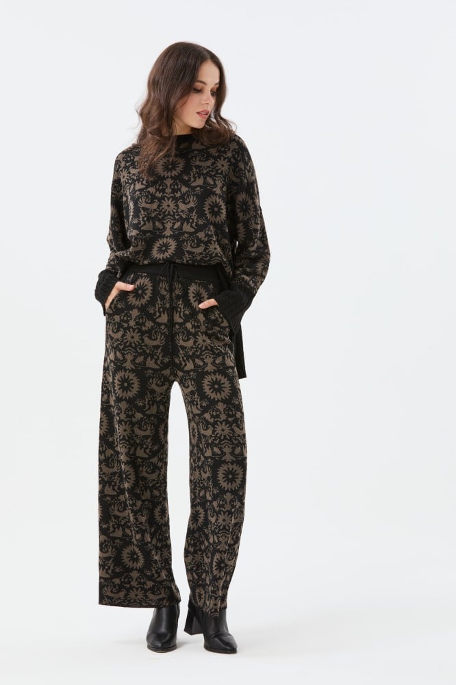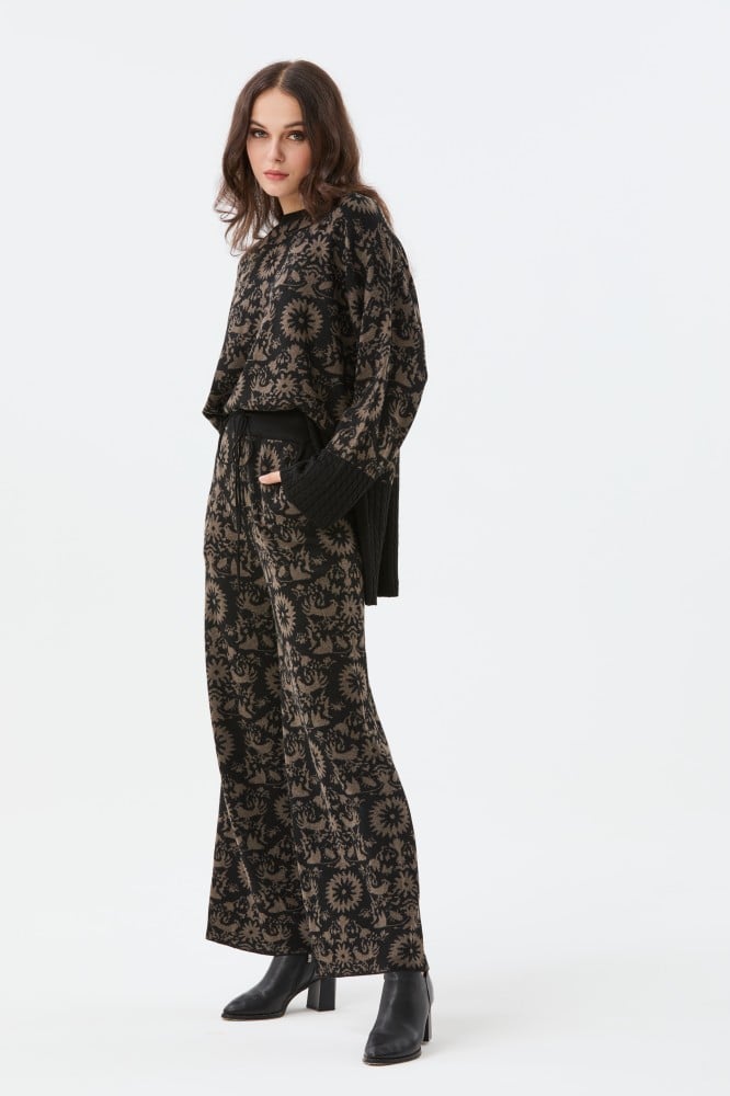 تمتعي بالدفء والأناقة هذا الشتاء بنطلون محبوك مزين بنقوش جذابة بتصميم بخصر مطاطي وبقصة واسعة، بجيوب ارتديها مع بلوزة بتصميم مماثل لمظهر عصري.