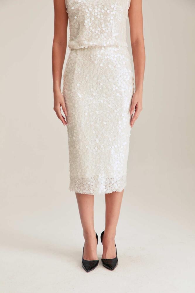 لإطلالة ساحرة في مناسباتك تألقي بتنورة مطرزة بالترتر اللامع بتصميم جذاب. تأتي بقصة مستقيمة بطول متوسط مزينة بفتحة من الخلف و يمكن تنسيقها مع تنورة لتكملي أناقة مظهرك.