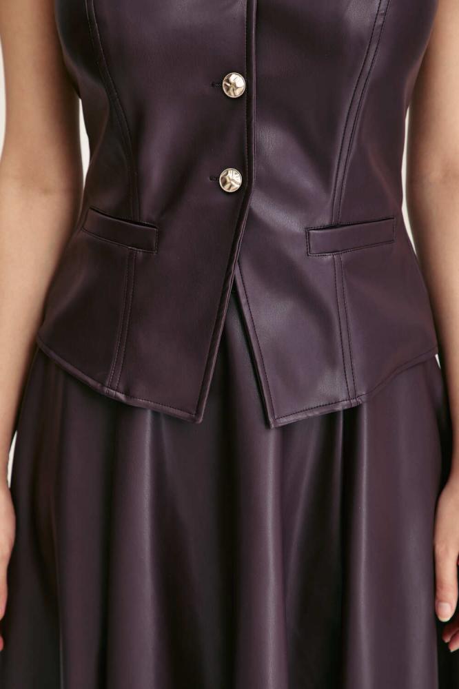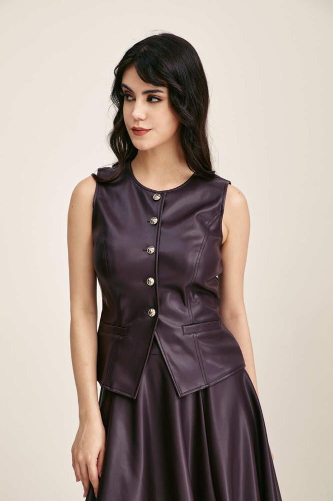 تألقي بإطلالة شتوية ساحرة ، جاكيت مصنوع من الجلد الصناعي بقصّة جذابة بتصميم بأزرار معدنية ومزين بجيوب ، ارتديه مع تنورة أو بنطلون وإكسسوارات ذهبية لإطلالة مميزة.