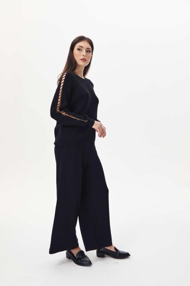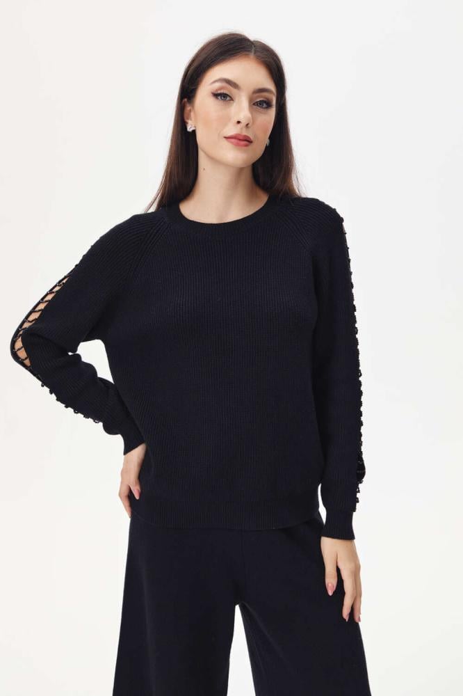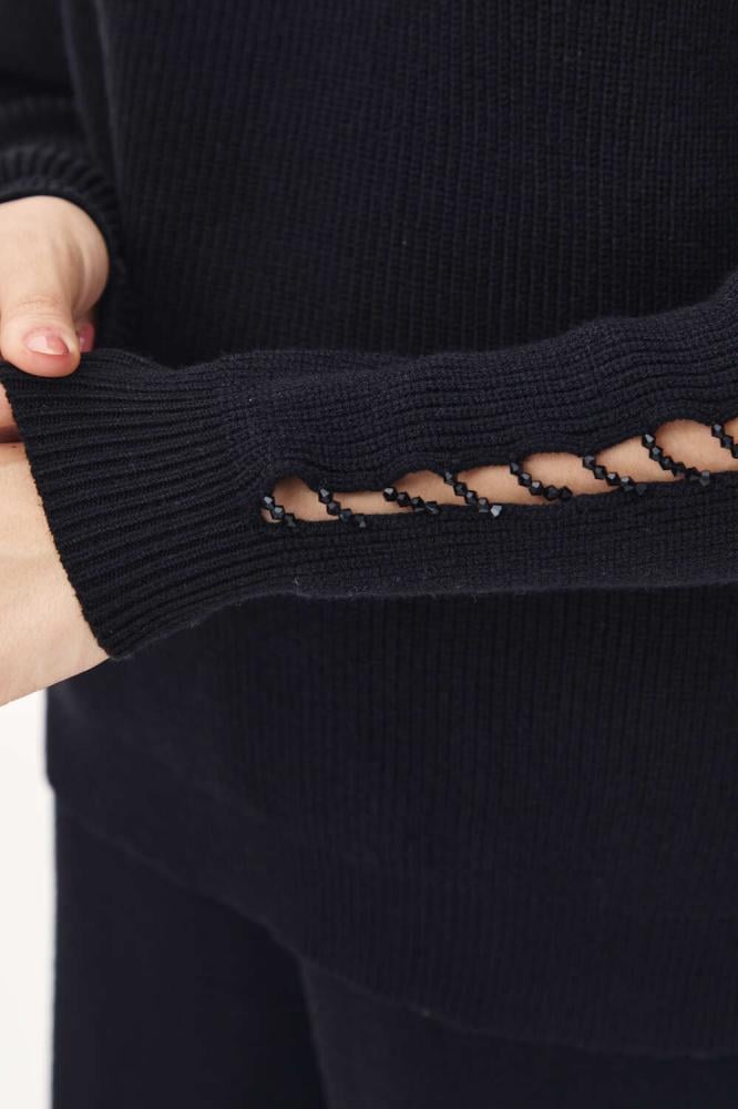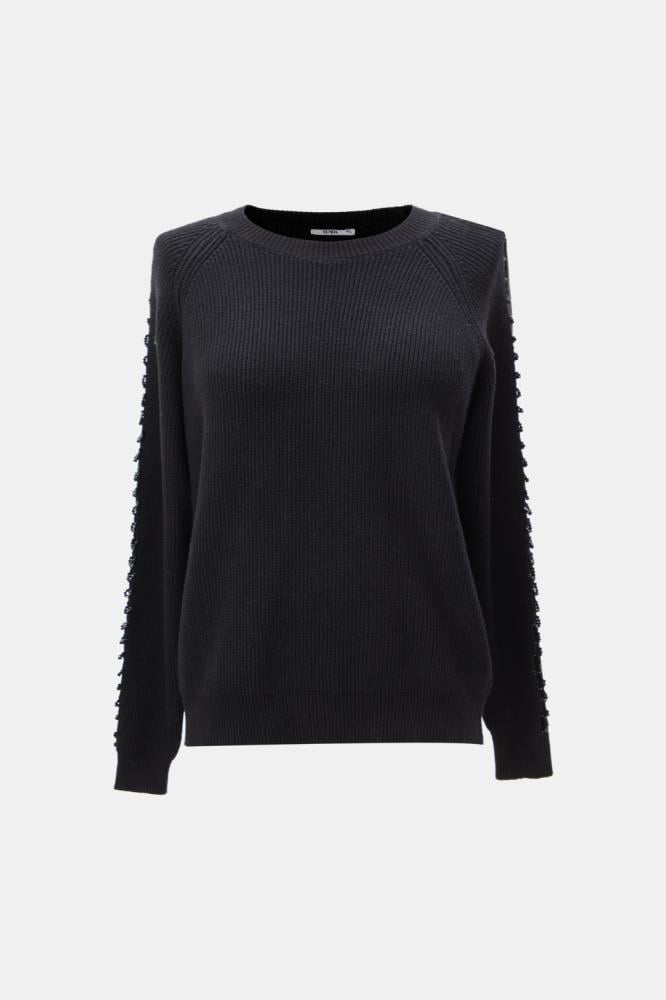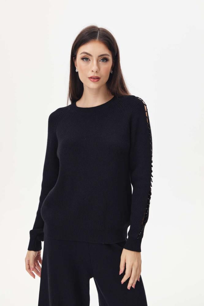أضيفي هذا القطعة المميزه لمجموعة ملابسك الشتوية وتمتعي بأفضل شعور بالدفء والأناقة أثناء طلعاتك الخارجية في الأجواء الباردة. بلوزة محبوكة بياقة مستديرة وبأكمام طويلة مفتوحة ومزينة بالخرز البراق وتأتي بقصة واسعة