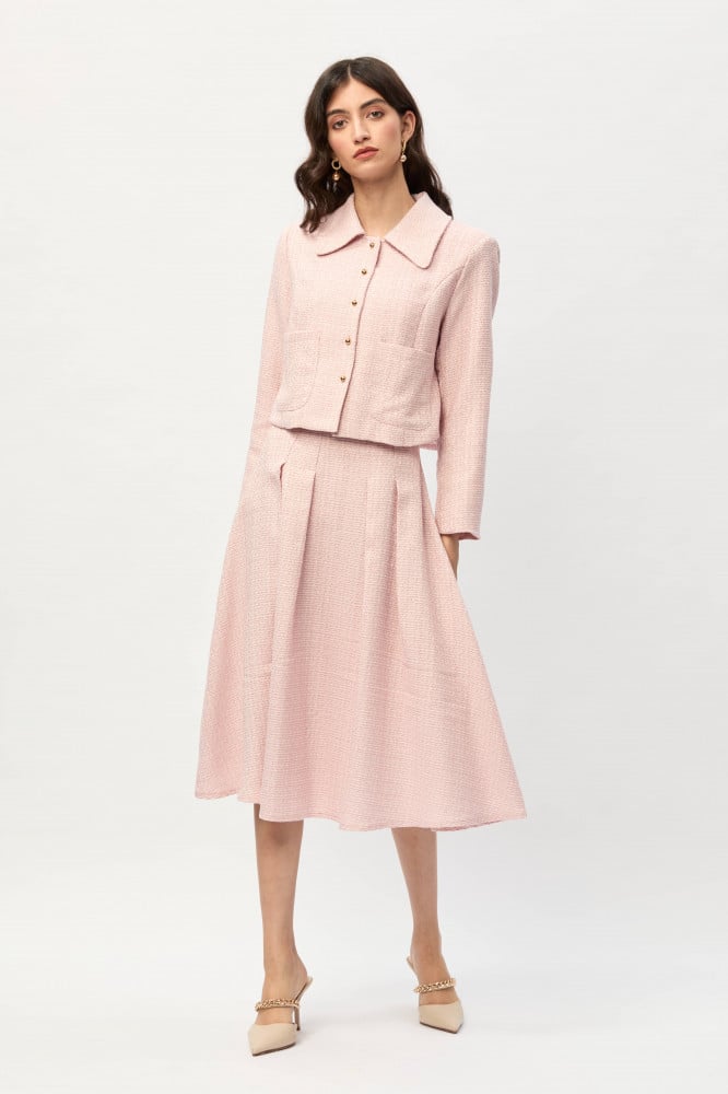 تألقي بإطلالة أنثوية جذابة مع هذا الجاكيت الأنيق مصنوع من التويد بارز الملمس ويتميز الجاكيت بتصميم بأكمام طويلة ويأتي بجيوب وبأزرار ذهبية للإغلاق. نسقيه كطقم مع تنورة لإطلالة كلاسيكية ساحرة.