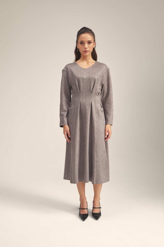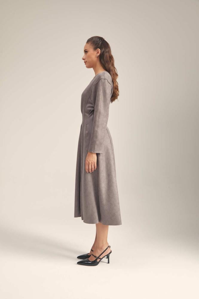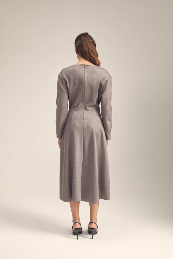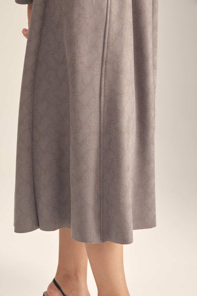 تصميم ينبض بالأنوثة والأناقة ، يتميز هذا الفستان بتصميم شمواه ، بقصة جذابة ضيقة الخصر وياقة مستديرة ، ومزين بنقشة جلد الأفعى