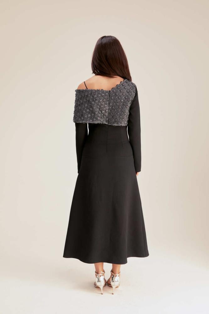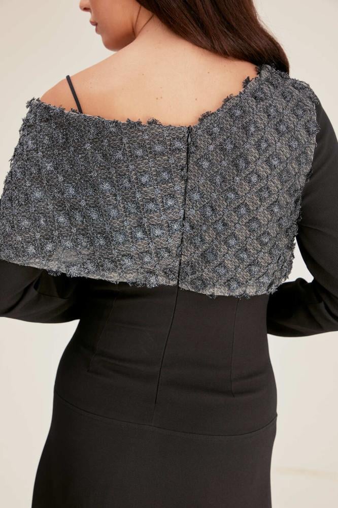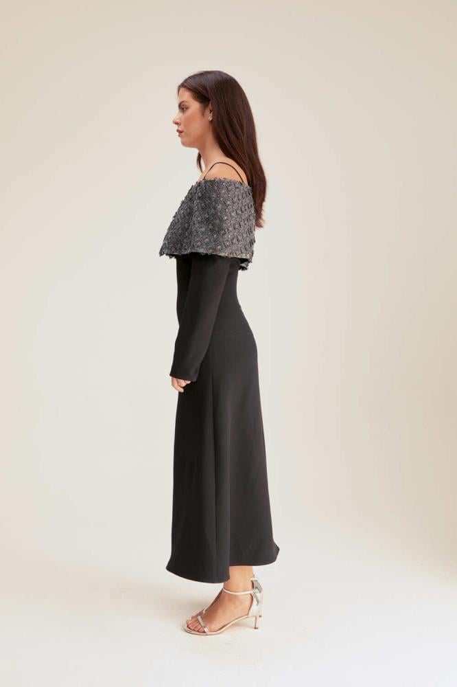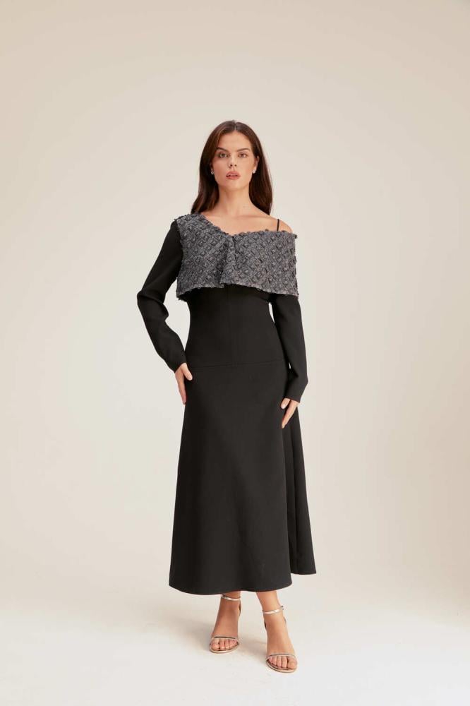 انعمي بإطلالة جذابة في المناسبات المسائية مع هذا الفستان الساحر بكتف واحد ، مصمم بتفاصيل فضية لامعة ، بفتحة رقبة على شكل حرف V وبقصة جذابة ،ويمكن تنسيقه مع إكسسوارات جذابة لمظهر ساحر.