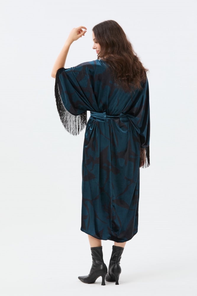 جاذبية استثنائية لمختلف مناسباتك ! فستان مخمل مزين بطبعات بتفاصيل عصرية ، يتميز بياقةV وبأكمام واسعة مزينة بالهدب بتصميم كسرات وبقصة غير متماثلة ،كما ويأتي مع حزام أنيق من نفس الخامة