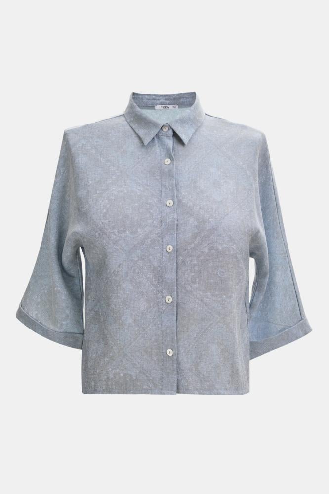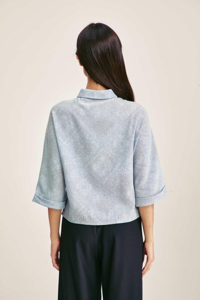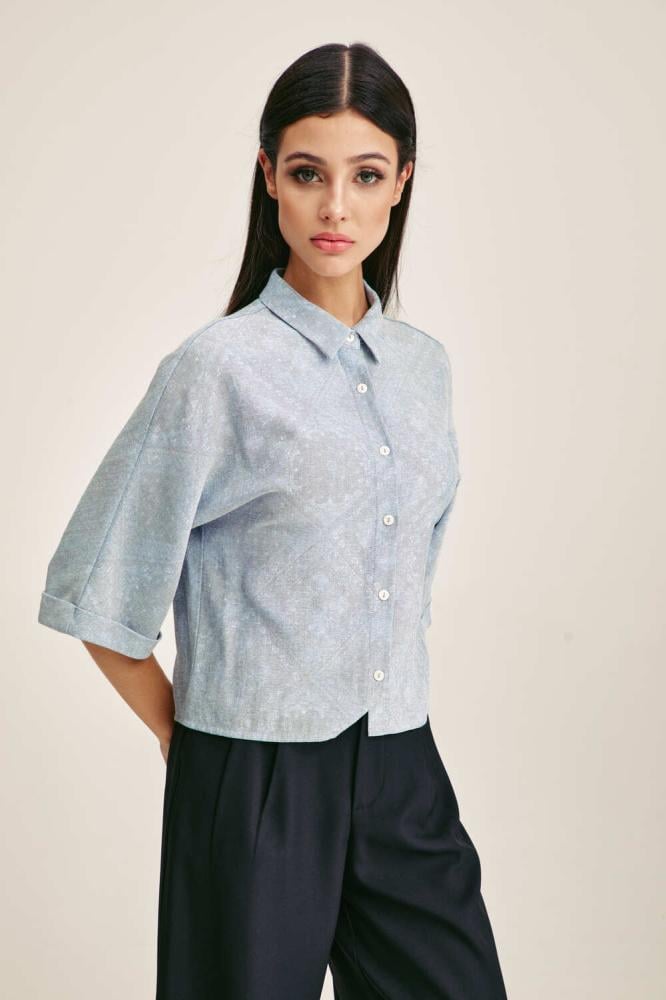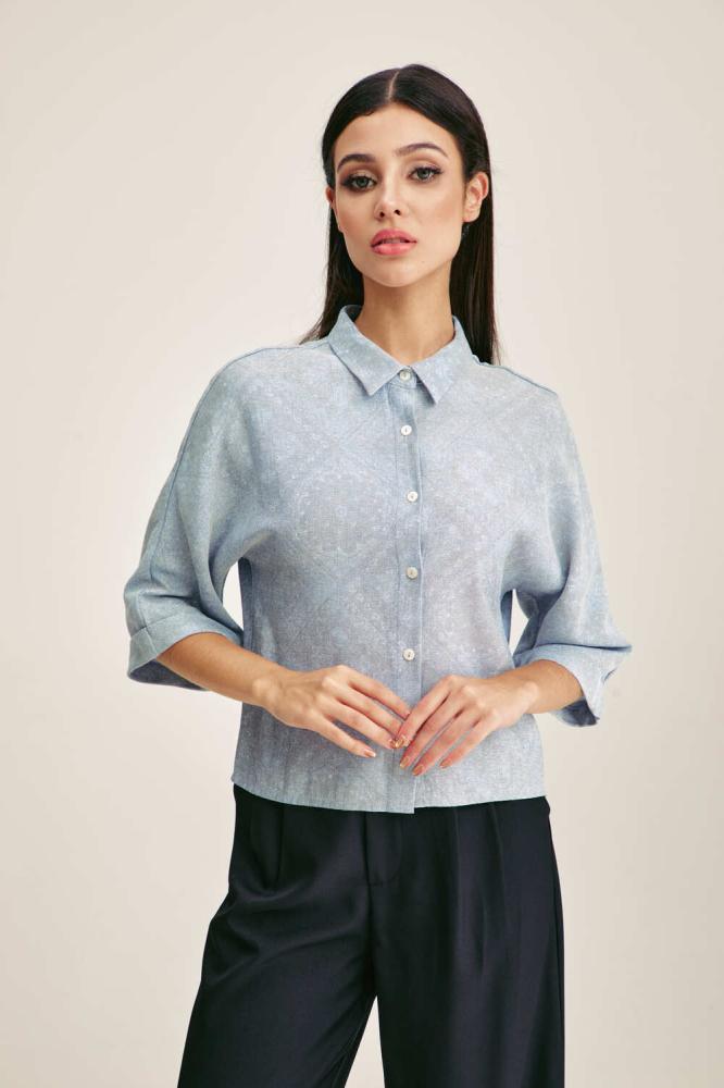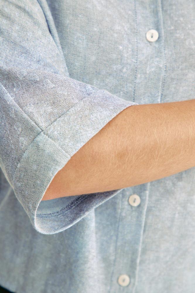 قميص بتصميم كلاسيكي أنيق مزين بطبعات بأكمام متوسطة الطول وبأزار للإغلاق ،ارتديه مع بنطلون سادة لتكملي أناقتك.