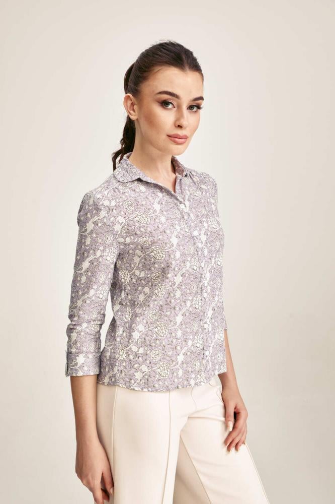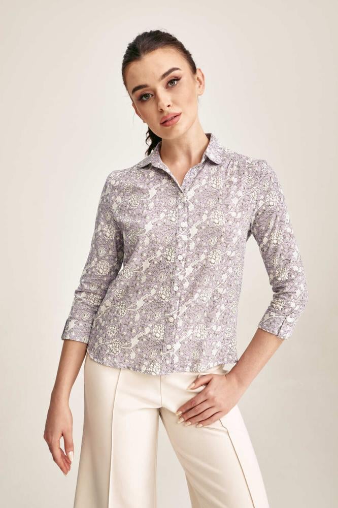 قميص بياقة كلاسيكية يناسب أوقات العمل وغيرها من المناسبات،بتصميم مزين بنقوش موردة وبأكمام متوسطة الطول وصف أزرار للإغلاق في الأمام ليمنحك إطلالة صيفية بسيطة وأنيقة.
