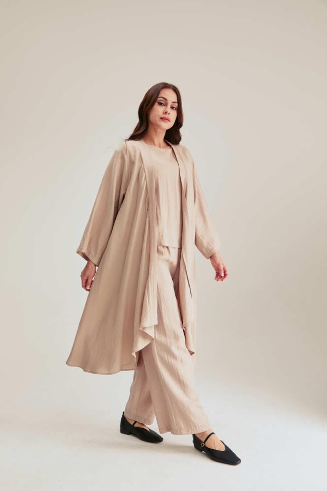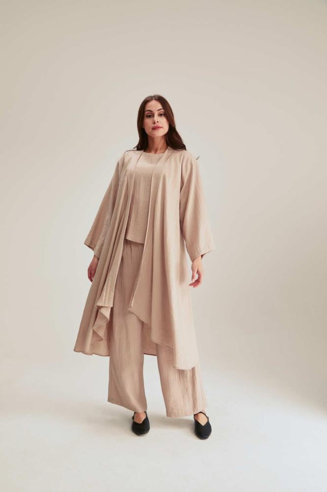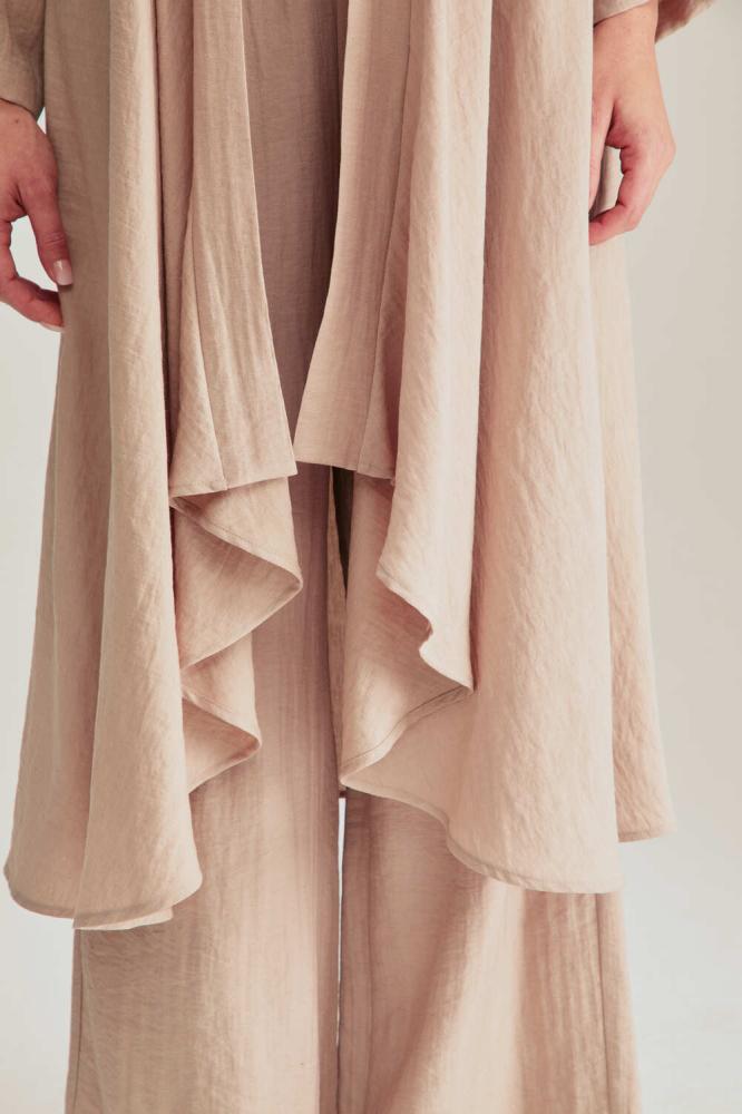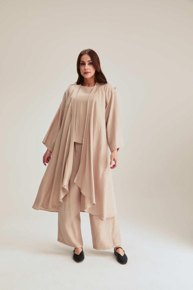 تألقي بإطلالة محتشمة راقية بكارديغان بتصميم بأكمام طويلة وبقصة غير متماثلة ، نسقية مع بلوزة وبنطلون واسع لإطلالة عصرية