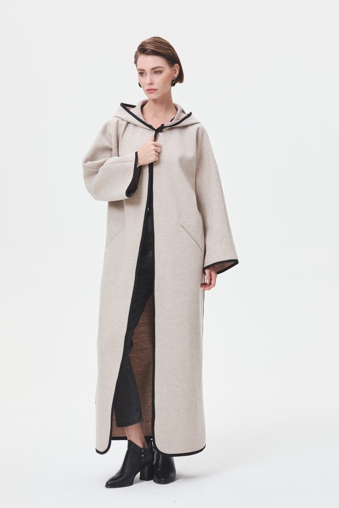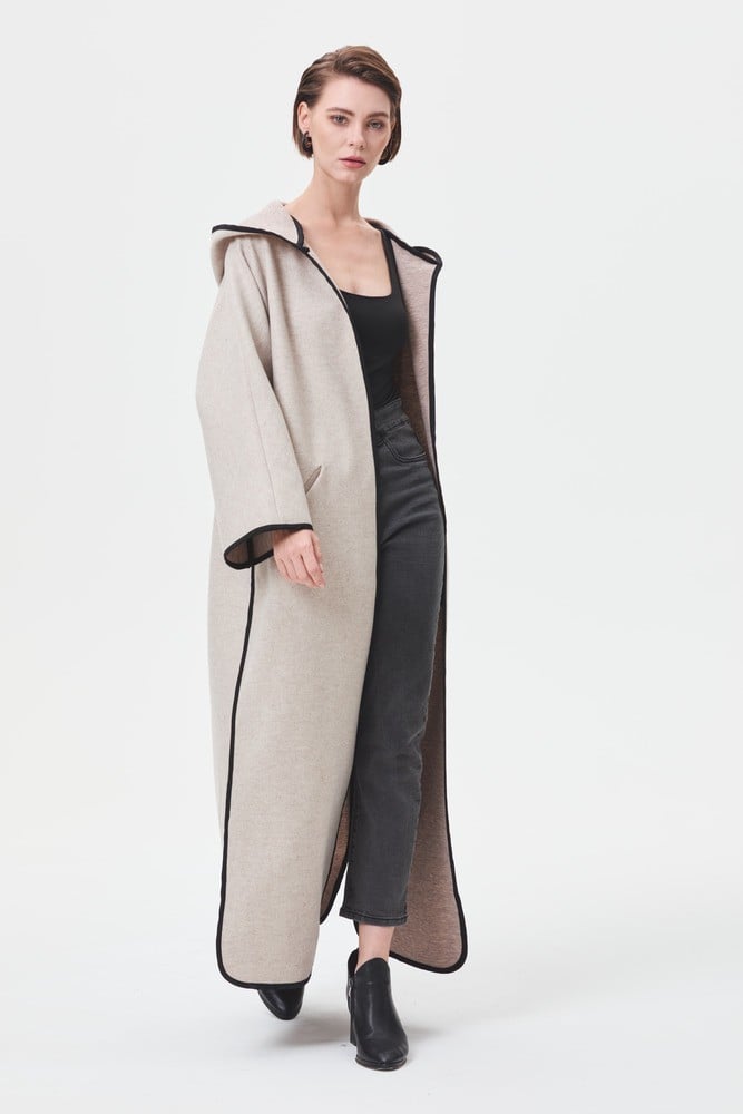 احصلي على إطلالة أنيقة في الأيام الباردة مع هذا الجاكيت الفخم بتصميم بجيوب ويتميز بقصة مفتوحة من الأمام ، وبحواف مزينة بشريط أسود