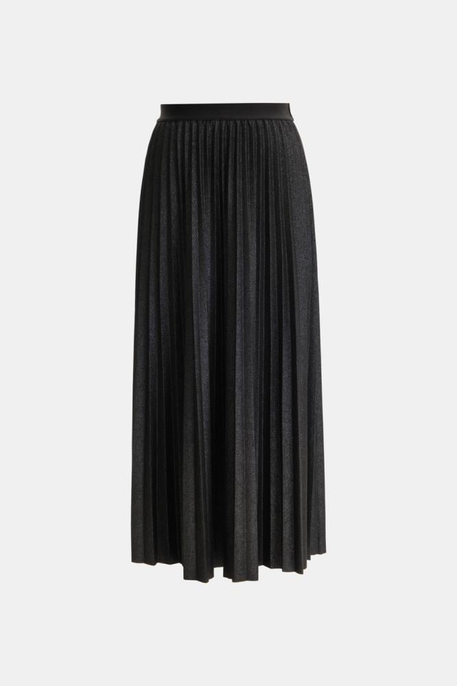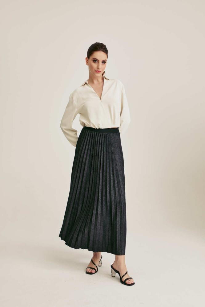 لإطلالة كلاسيكية متفردة، تنورة مصنوع من خامة مطاطية بلون لامع ، مصممة بطول ميدي وكسرات تضفي عليه لمسة أنثوية أنيقة ، نسقيه مع تنورة بتصميم مماثل للوك شيك في مناسباتك المميزة