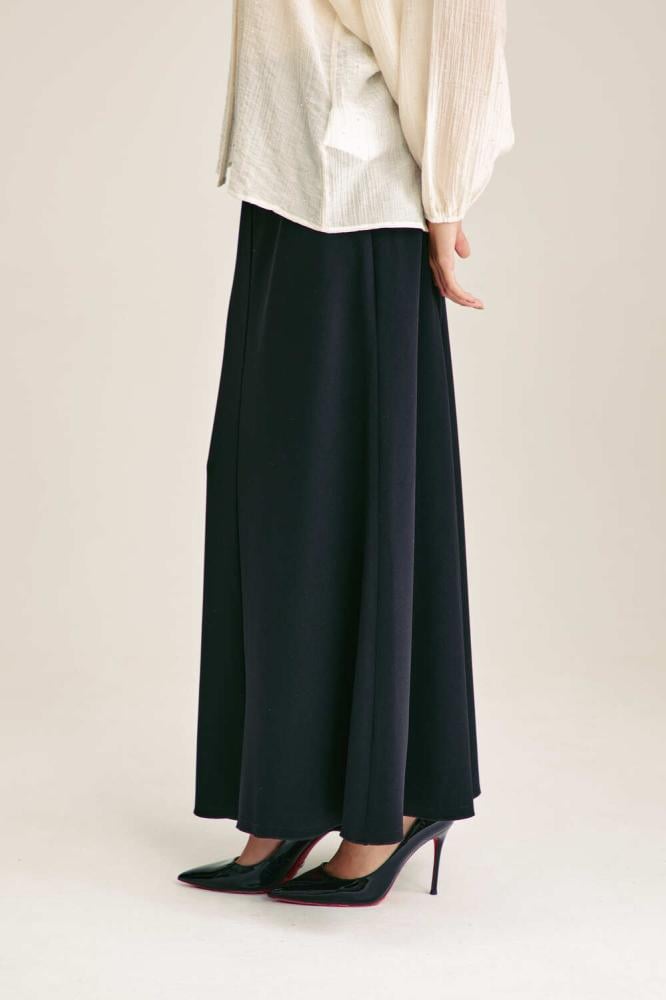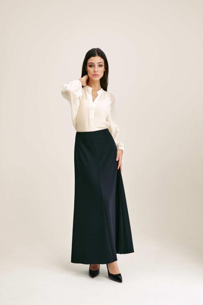 تنورة طويلة مناسبة للعمل، بتصميم واسع مريح وسحاب إغلاق جانبي، خيار عملي وأنيق يمنحك إطلالة محتشمة ومرتبة لأيام الدوام والمكتب