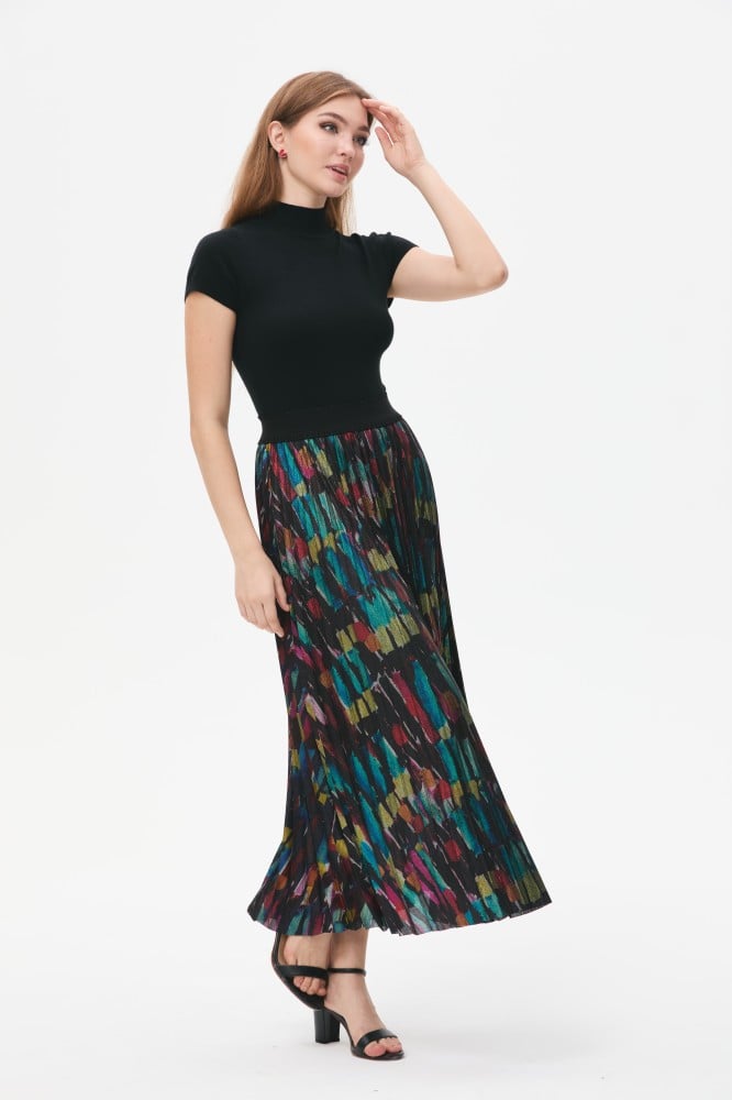 جددي تشكيلة ملابسك الأنيقة بإضافة هذه التنورة العصرية ، تتميز بتفاصيل كسرات وزدانه بطبعات لامعة بلون لافت ومصممة بخصر مطاطي