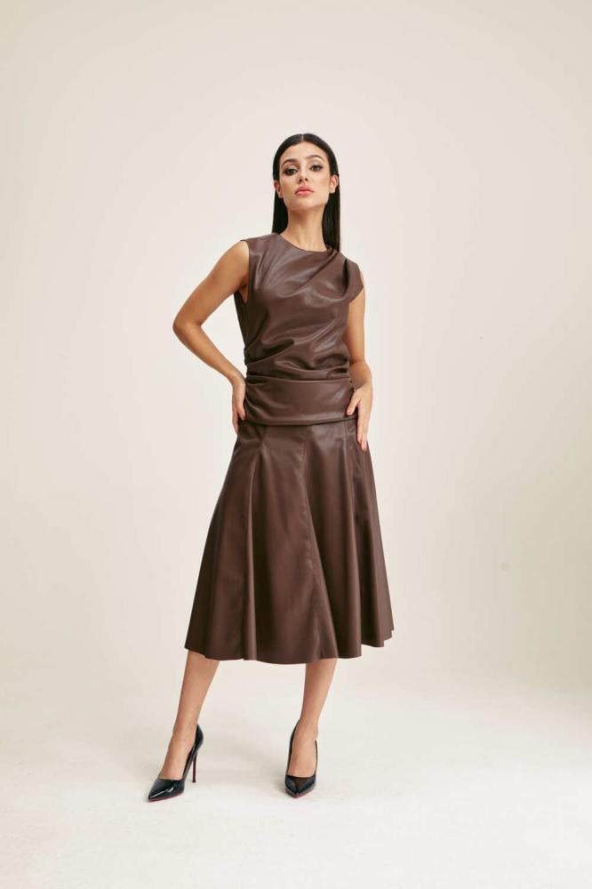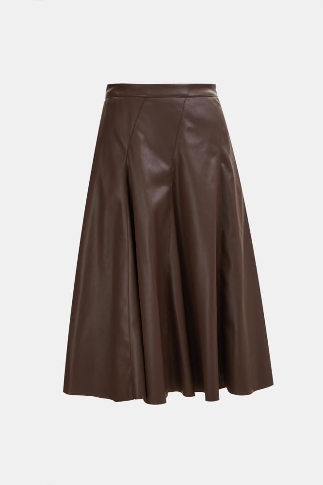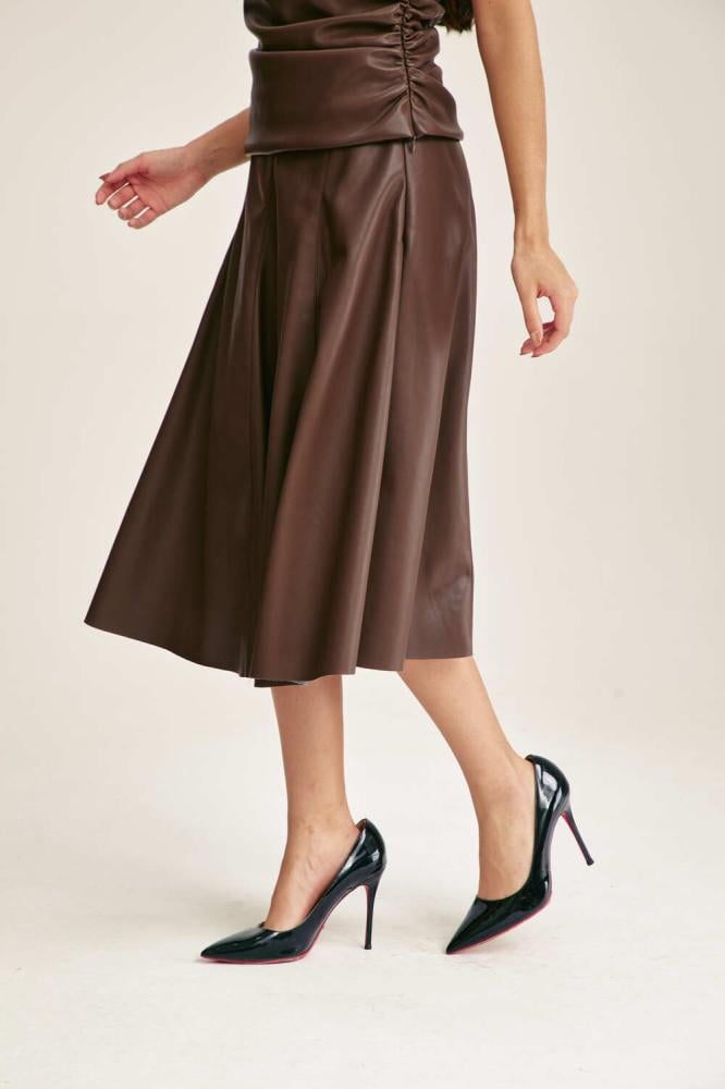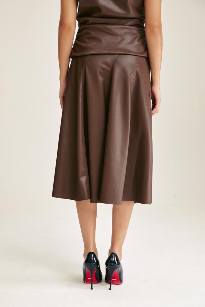 تنورة جلد بني بتصميم كلوش يمنحك إطلالة عصرية متجددة ولمسة أنثوية راقية. خامة ناعمة مع سحاب مخفي لراحة وأناقة عملية في كل حركة. نسقيها مع بلوزة مماثلة لتكتمل إطلالتك الجذابة.