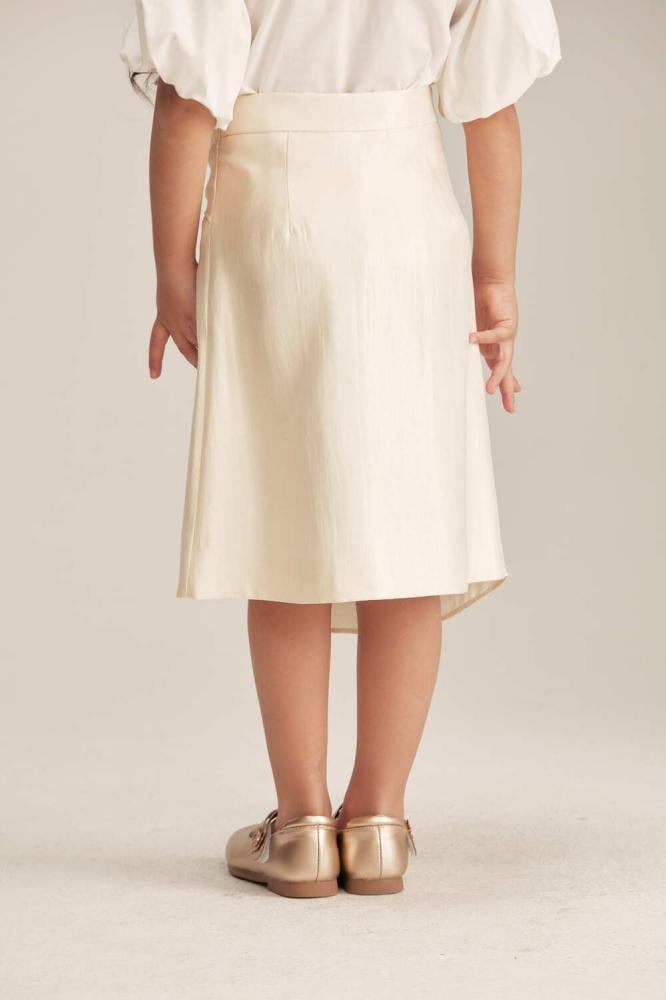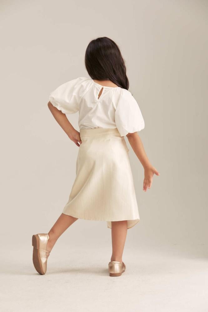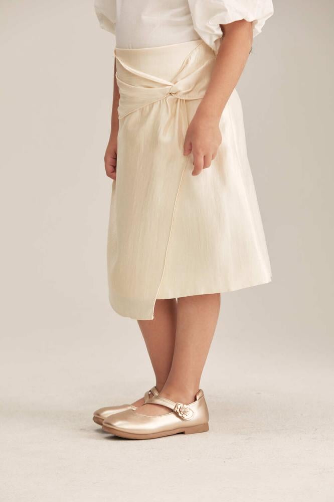ستنعم صغيرتكم بإطلالة مذهلة عند ارتداء تنورة بطول متوسط ، تتميز بتصميم لف ومزينه بعقدة