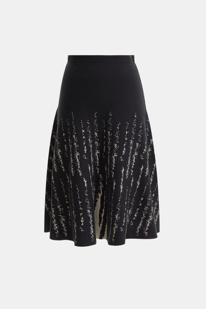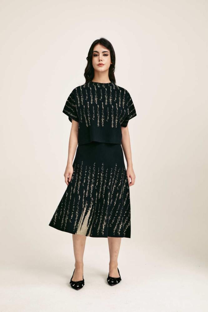 بلوزة محبوكة أنيقة ، بتصميم كلاسيكي بياقة مستديرة و بأكمام قصيرة ، مزينة بنقوش لامعة يمكن تنسيقها مع تنورة مماثلة لإطلالة أنيقة