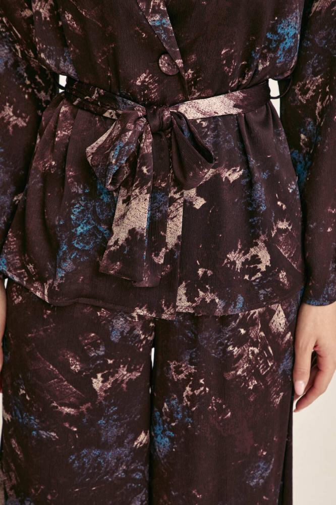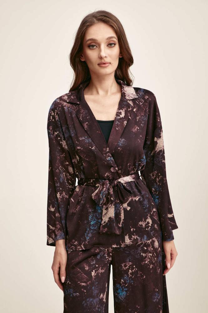 جاكيت بتصميم كلاسيكي أنيق بتفاصيل جذابة مزدان بنقوش عصرية بزر إغلاق ،ويتميز بأكمام طويلة واسعة وحزام قابل للربط ، ارتدية مع بنطلون مماثل لمظهر أنيق .