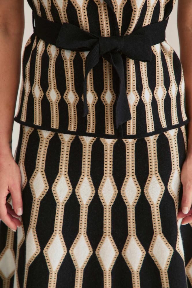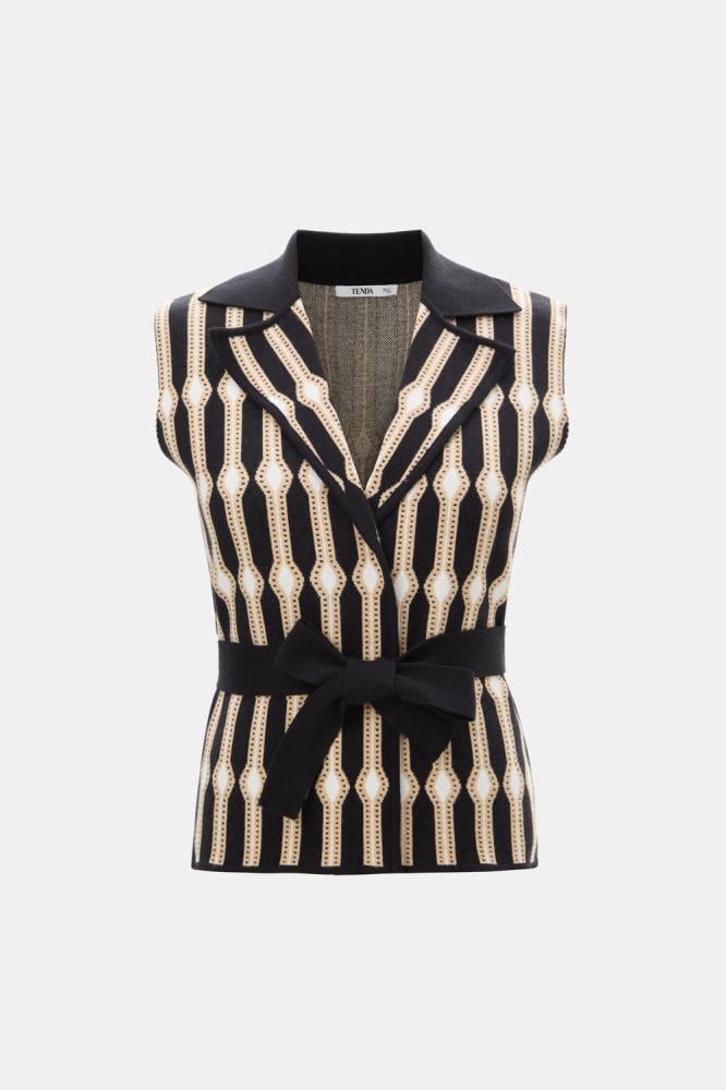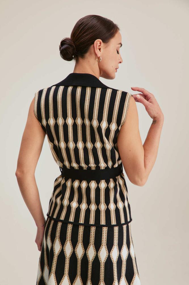 انعمي بإطلالة شتوية ساحرة مع هذا الجاكيت المحبوك ، المصمم بياقة مطوية أنيقة و بدون أكمام، مزين بنقوش هندسية و يأتي مع حزام ربط يبرز جمال الخصر ويمنحك إطلالة متناسقة.