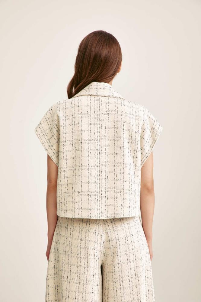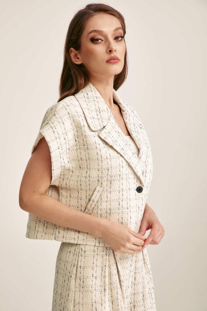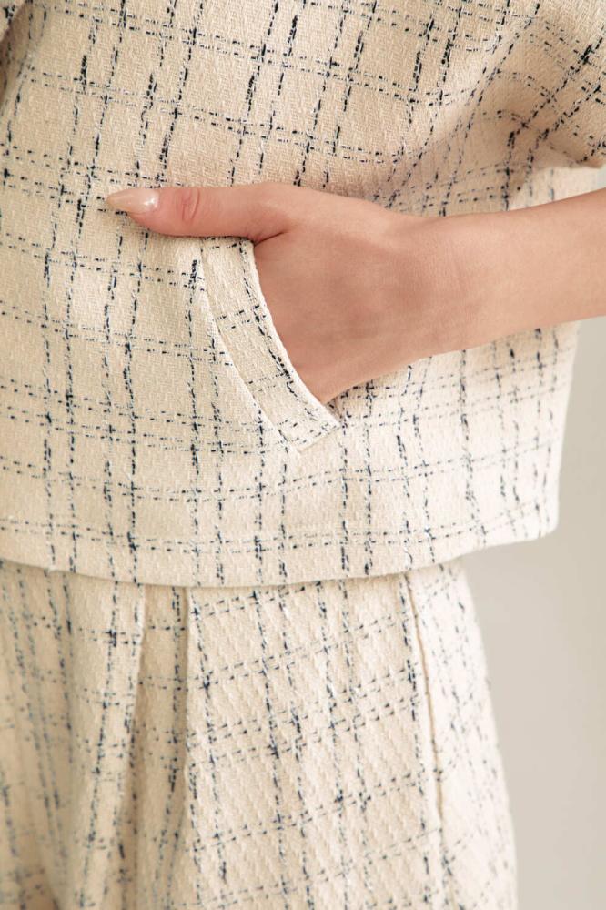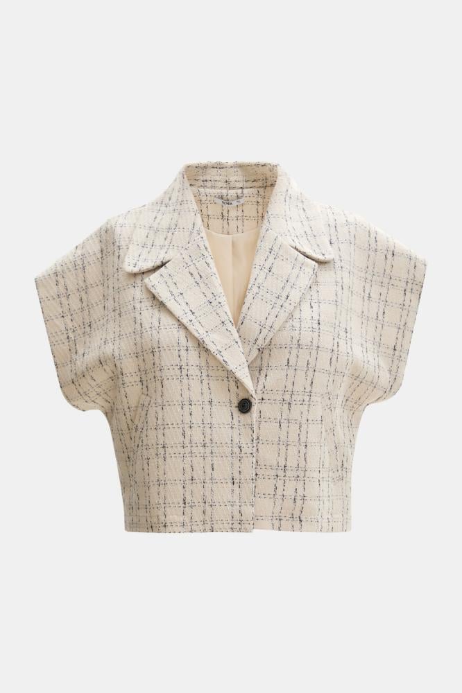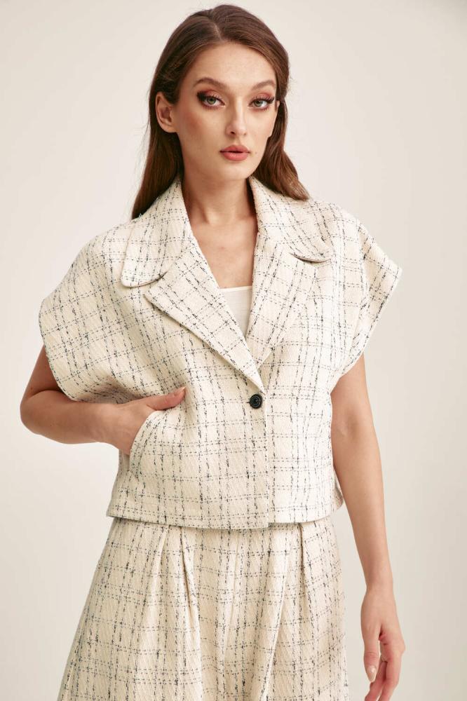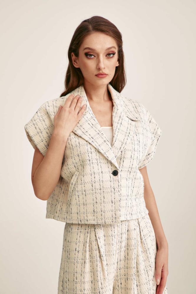 جاكيت قصير يجمع بين الطابع الكلاسيكي واللمسات الجمالية العصرية. ويأتي بتصميم مصنوع من قماش تويد لمظهر أنيق ،بتصميم بأكمام قصيرة ومزينه ويأتي بجيوب عملية