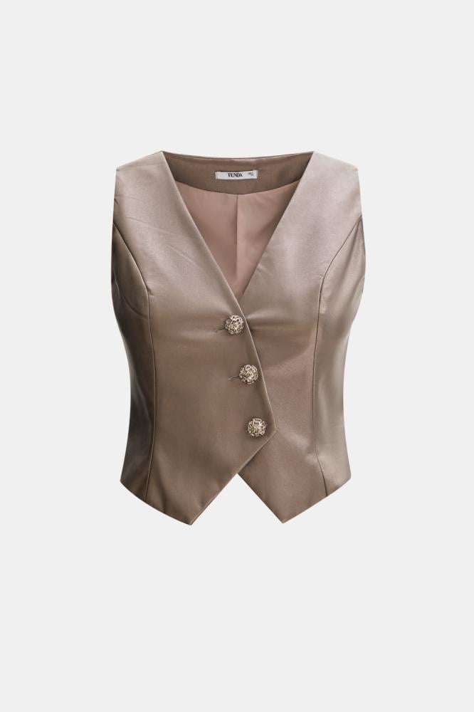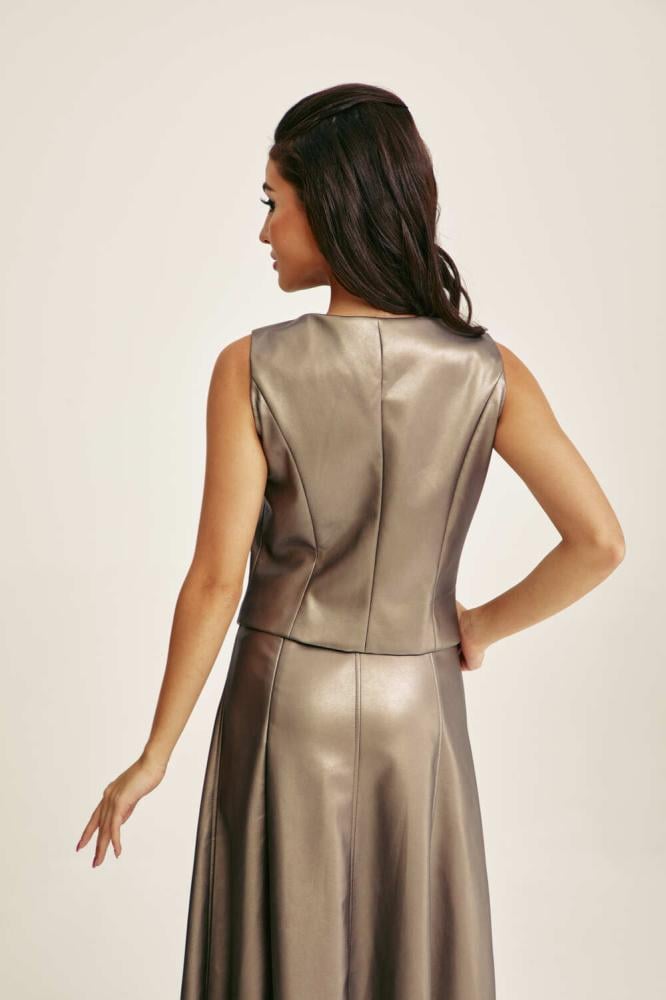 تألقي بإطلالة شتوية ساحرة ، جاكيت مصنوع من الجلد الصناعي بقصّة جذابة بتصميم بأزرا ر معدنية للإغلاق من الأمام ، بقصة غير متماثلة ، ارتديه مع تنورة مماثلة وإكسسوارات لإطلالة مميزة.